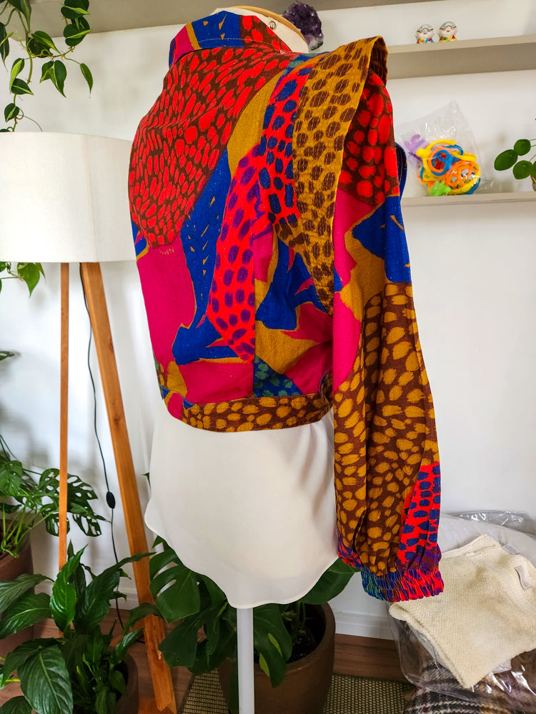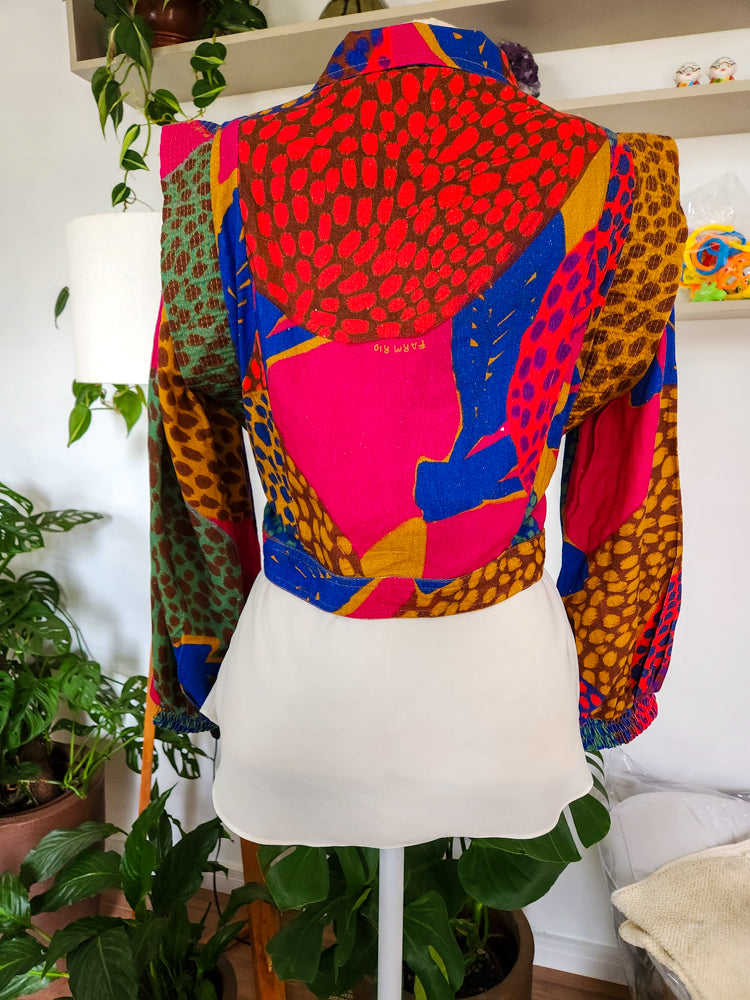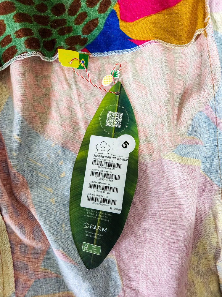 Jaqueta curta da Farm, modelo Jaquitas — uma peça statement! Estampa animal print colorida, vibrante e exclusiva da marca. Estrutura de blazer com ombreiras, botões forrados e acabamento refinado. Confeccionada em viscose com linho, proporciona toque suave e leveza. Perfeita para compor looks criativos e cheios de personalidade.