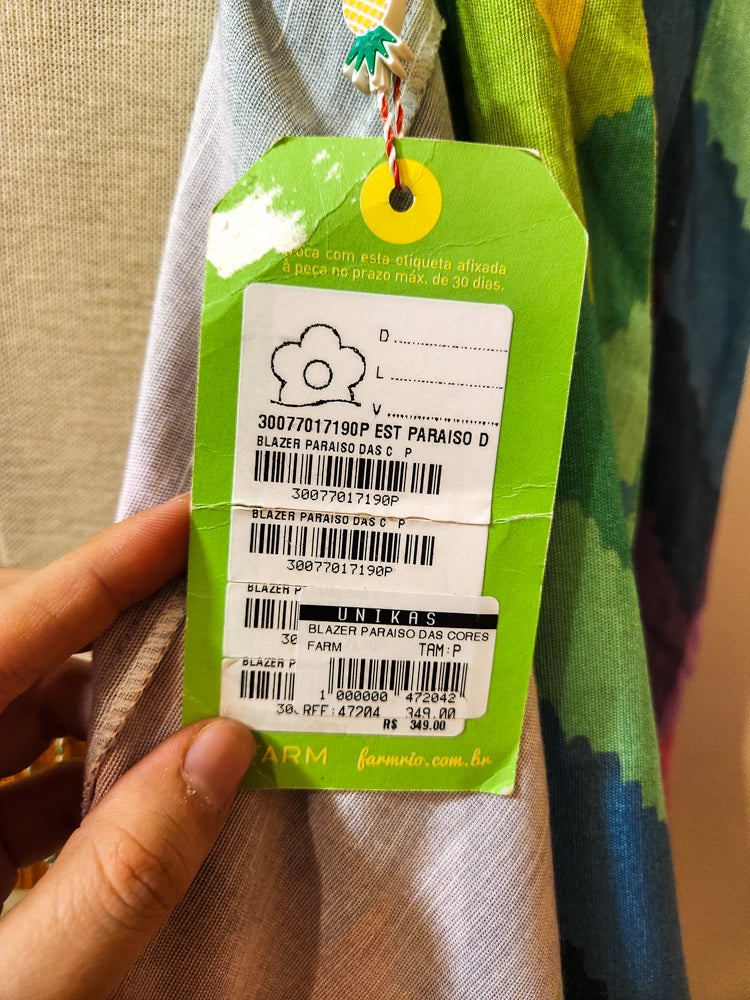 Traga a alegria do arco-íris para o seu guarda-roupa com o Blazer Farm Rio, confeccionada em um tecido plano de alta qualidade, composto por 61% viscose e 39% algodão, garantindo frescor, estrutura e um toque natural impecável.