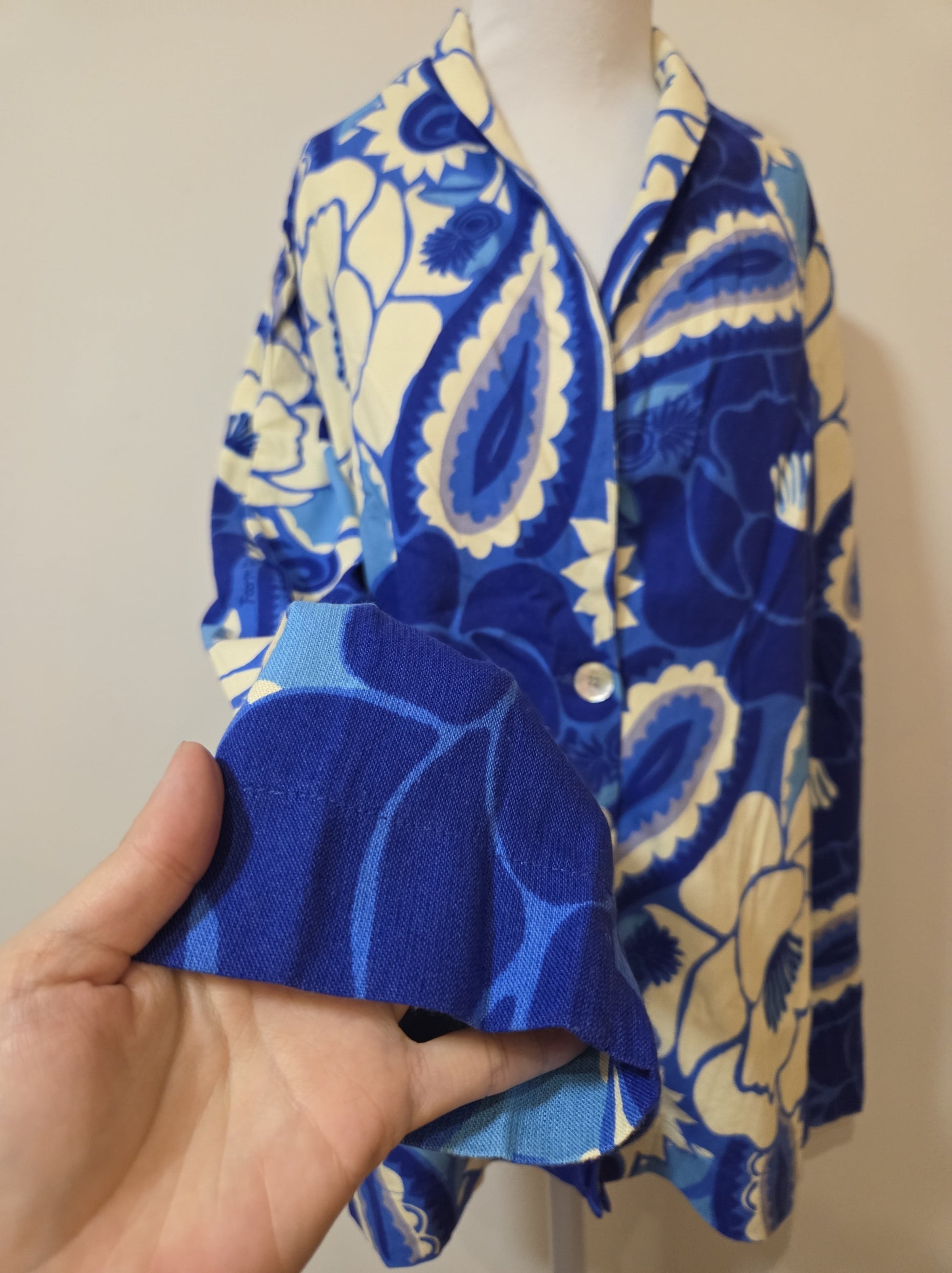 A estampa é a marcante "Tropical Groove", um design em blocos de azul royal, azul claro e off-white/creme, com grandes motivos florais e elementos paisley estilizados. A combinação de cores é vibrante e sofisticada.