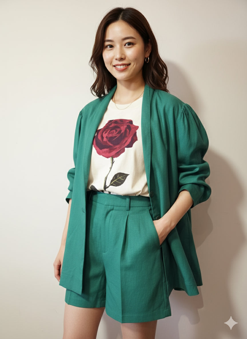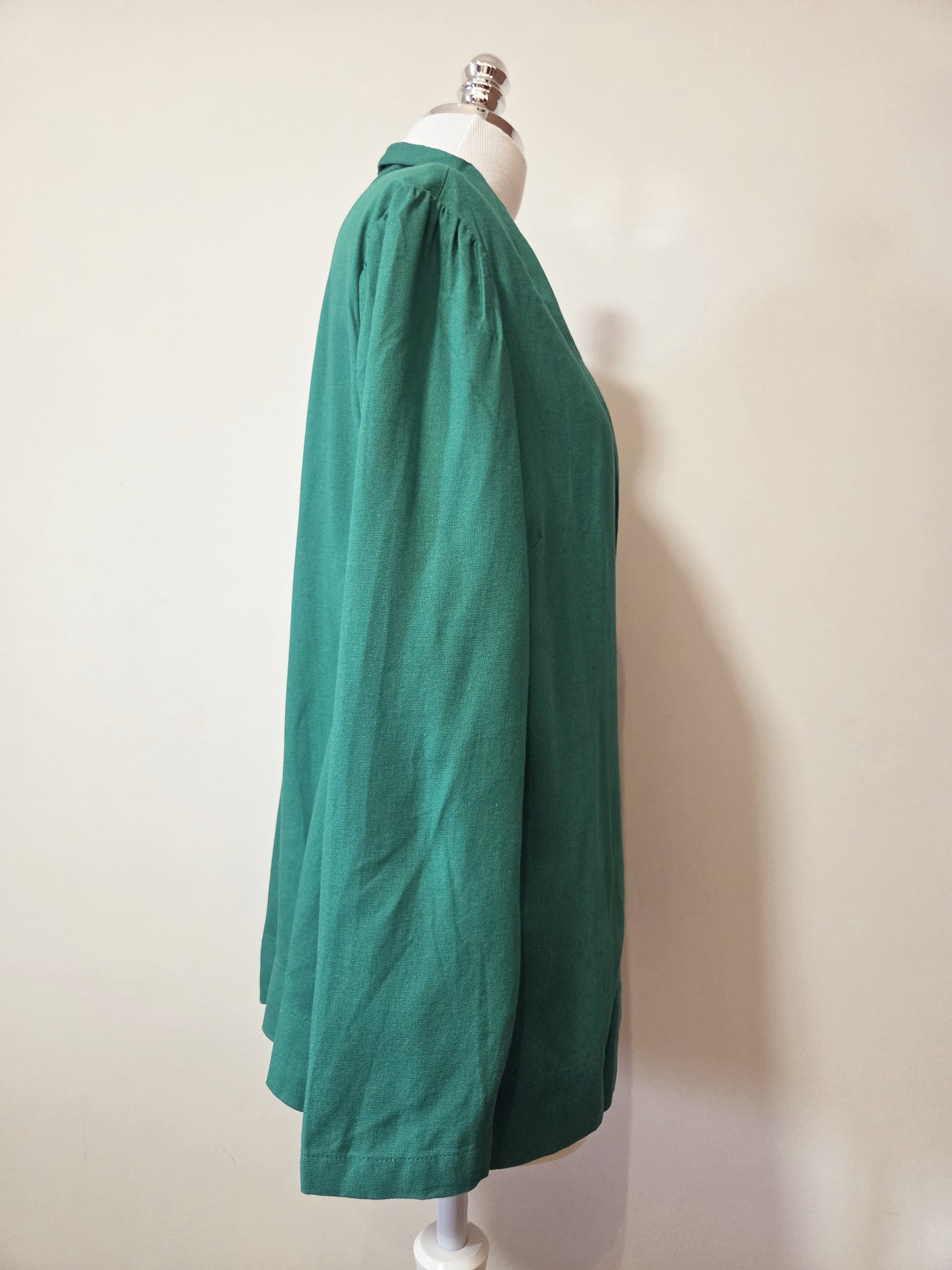 A peça apresenta uma vibrante cor verde bandeira, sem estampas, conferindo um visual moderno e versátil. O design conta com lapelas elegantes, fechamento frontal por dois botões e mangas longas. A modelagem é mais solta e ampla, proporcionando conforto e um caimento despojado-chic. Versátil para compor looks casuais ou mais elaborados.