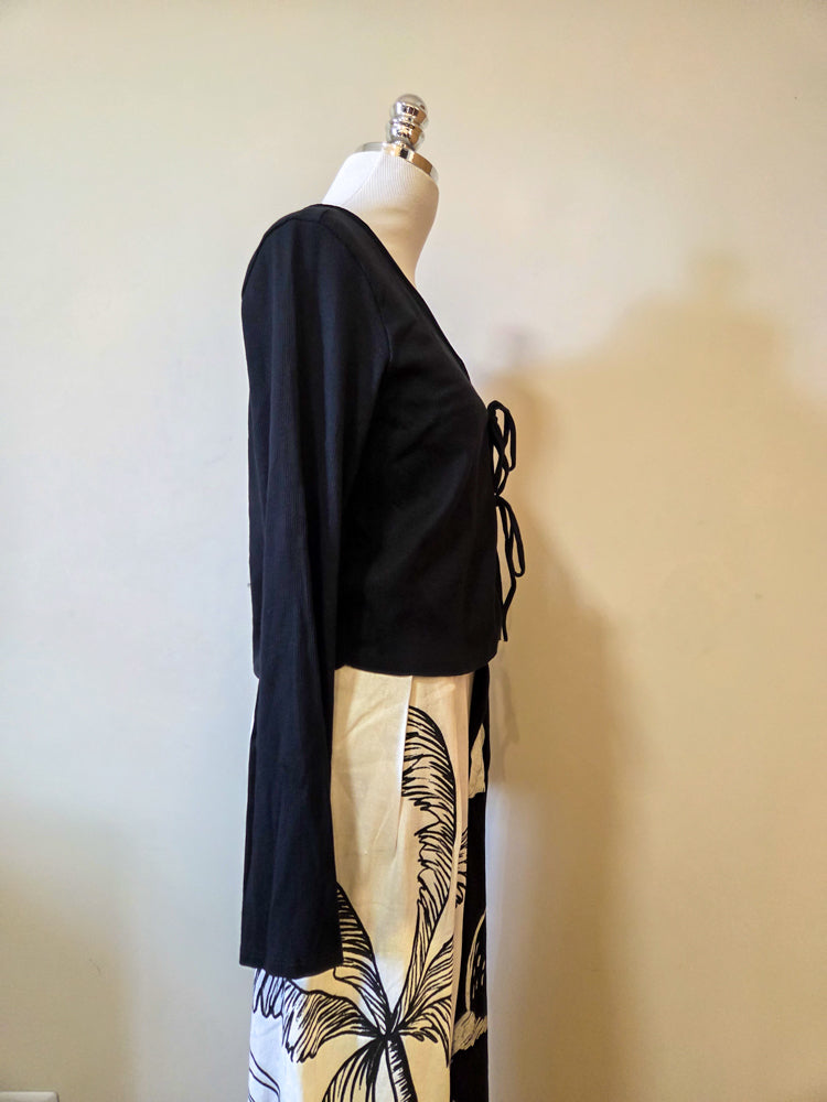 Detalhes: Estampa floral viva, Amarração frontal com cordões, Elástico nas costas, Gola ombro a ombro