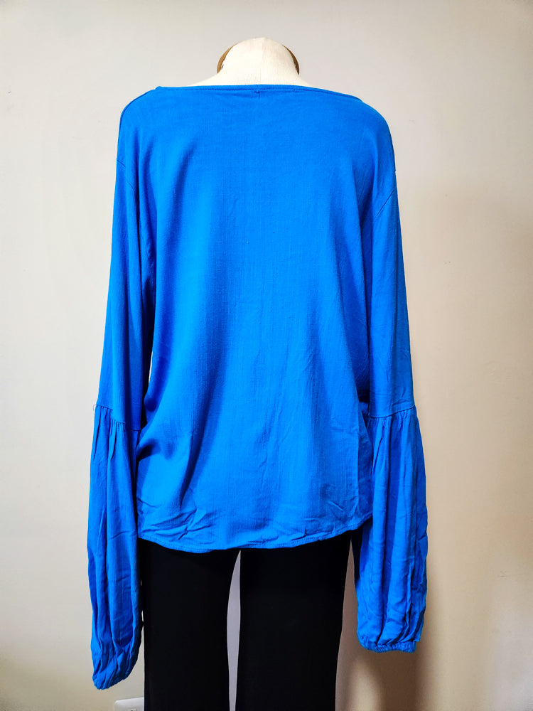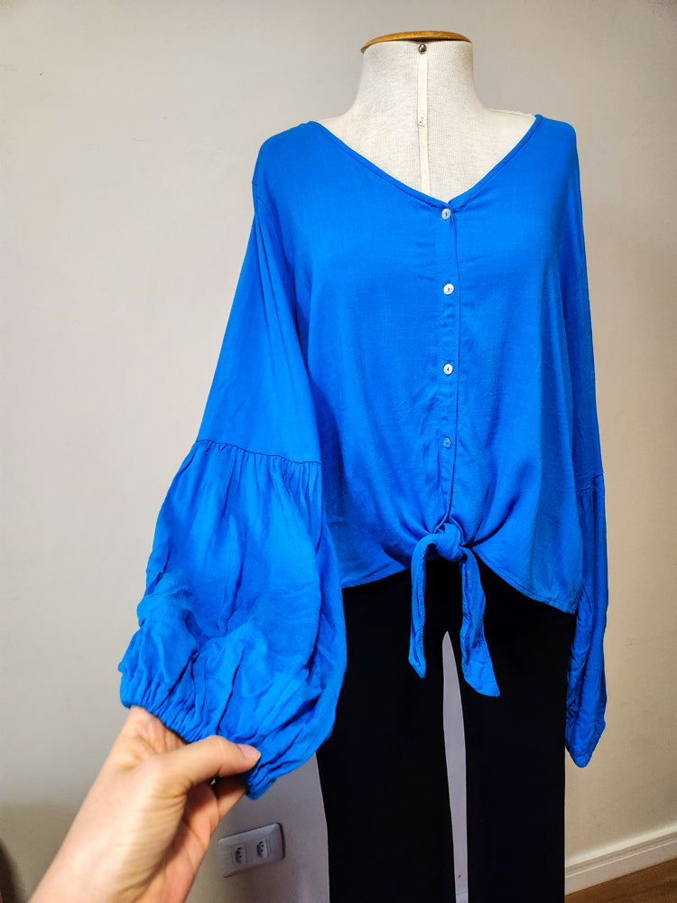 Blusa feminina nova, na cor azul royal, confeccionada em 100% viscose. O tecido leve e com uma textura sutil proporciona um caimento fluído e confortável, ideal para looks descontraídos e frescos. A peça se destaca pelo seu design moderno, com decote em V e fechamento frontal por botões funcionais perolados.