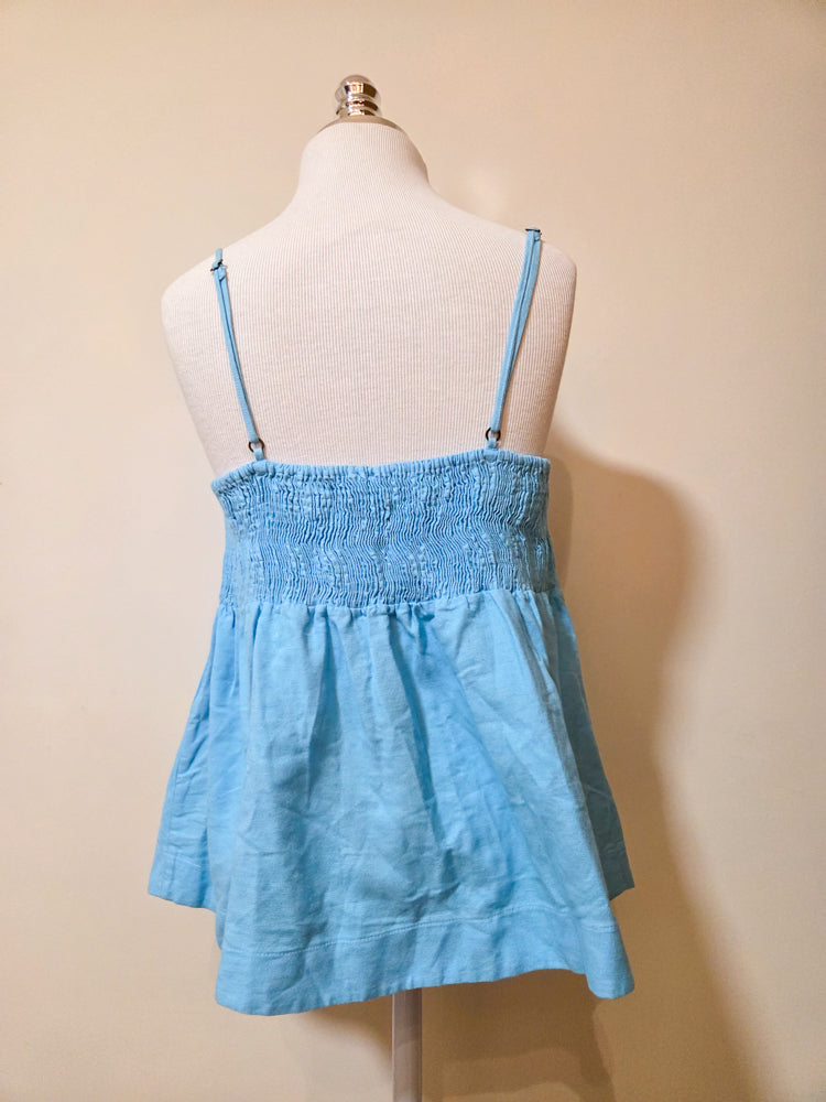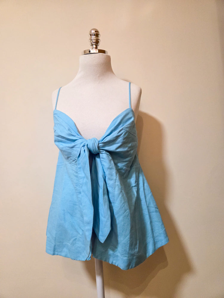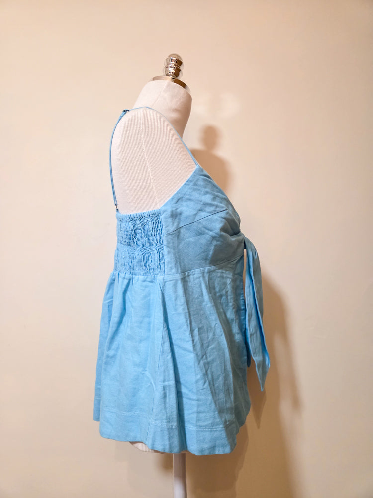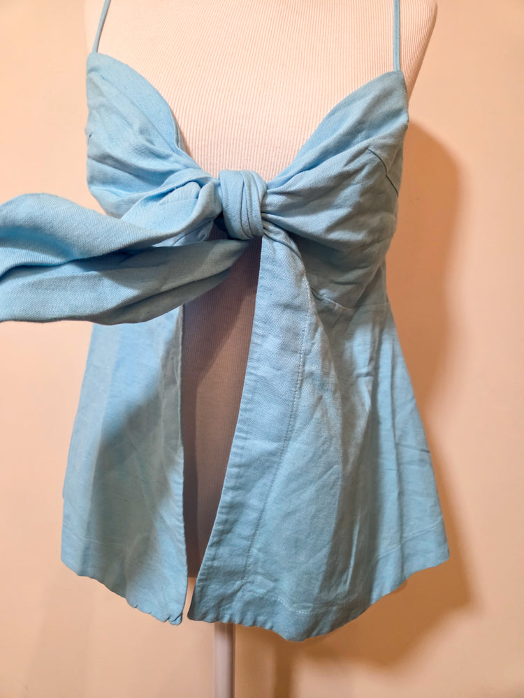 Esta blusa azul claro é perfeita para transformar qualquer look com um toque leve e fresco. Confeccionada em uma malha de toque suave que mistura algodão, viscose, modal e linho, ela tem fluidez, respirabilidade e um acabamento levemente encorpado, ideal para dias quentes ou para sobrepor em produções casuais. O destaque fica por conta do laço frontal generoso, que amarra-se logo abaixo do busto, criando um corte “empire” que valoriza a cintura e produz um franzido elegante na parte superior da peça.