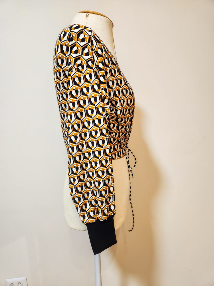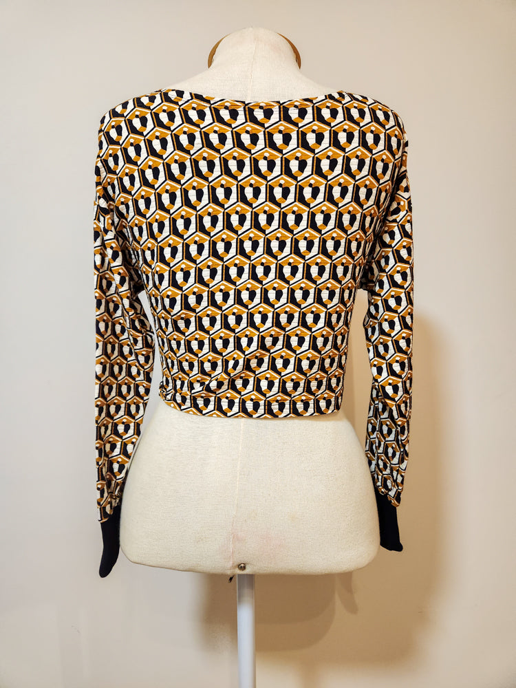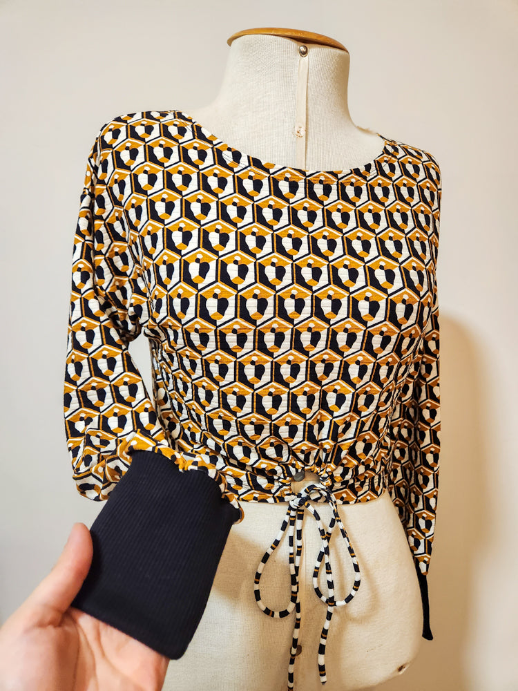 Blusinha da marca Farm com estampa exclusiva de cajus em tons de amarelo, preto e branco. Modelo manga longa, em tecido canelado com leve elasticidade, feita em viscose com elastano. Possui detalhe franzido com amarração frontal ajustável na barra. Peça nova, com tag original.