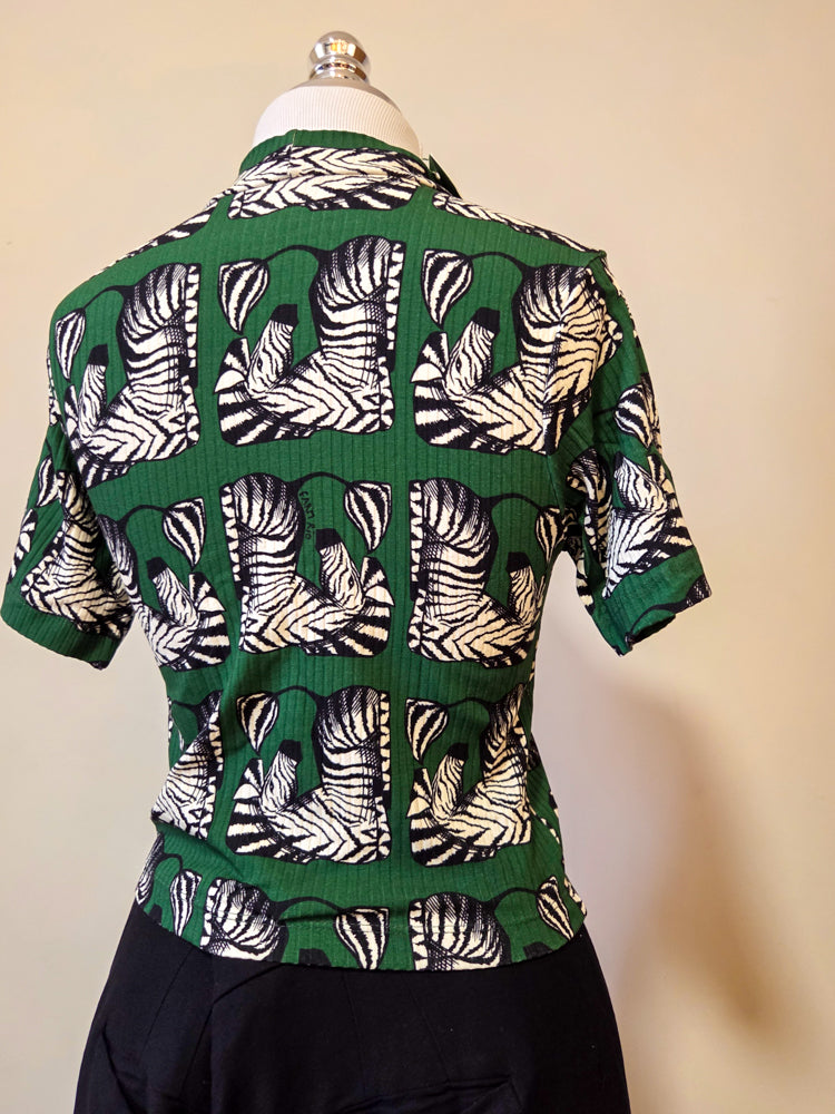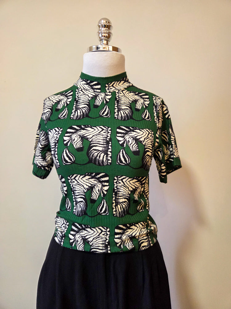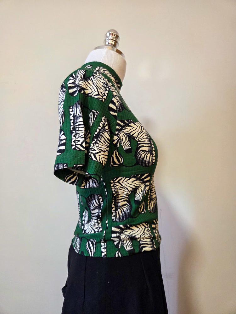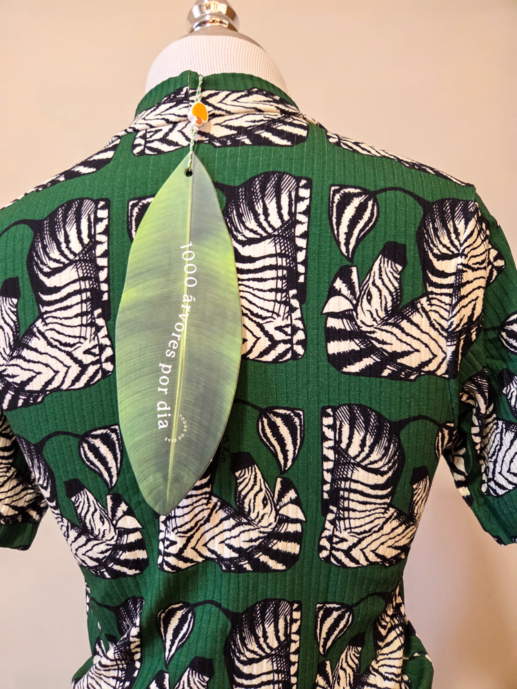 Blusa feminina Farm, modelo canelado com estampa de zebra sobre fundo verde. Possui gola alta e mangas curtas, ideal para um visual moderno e despojado. Tecido confortável com leve elasticidade, perfeito para compor looks estilosos em diferentes ocasiões.