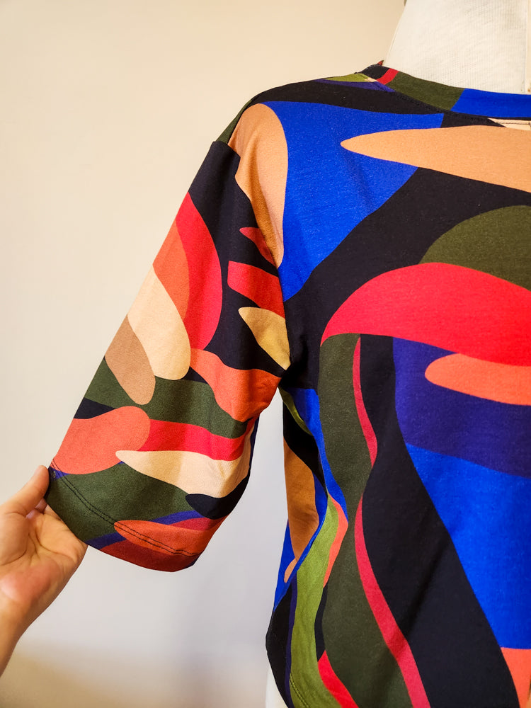 Com um mix vibrante de cores e formas, essa blusinha Farm traz uma estampa abstrata que transmite arte e estilo em uma só peça. O tecido leve e maleável de viscose com elastano garante conforto e caimento impecável. Destaque para o mangão moderno, que valoriza produções casuais ou criativas. Ideal para quem ama moda com personalidade!