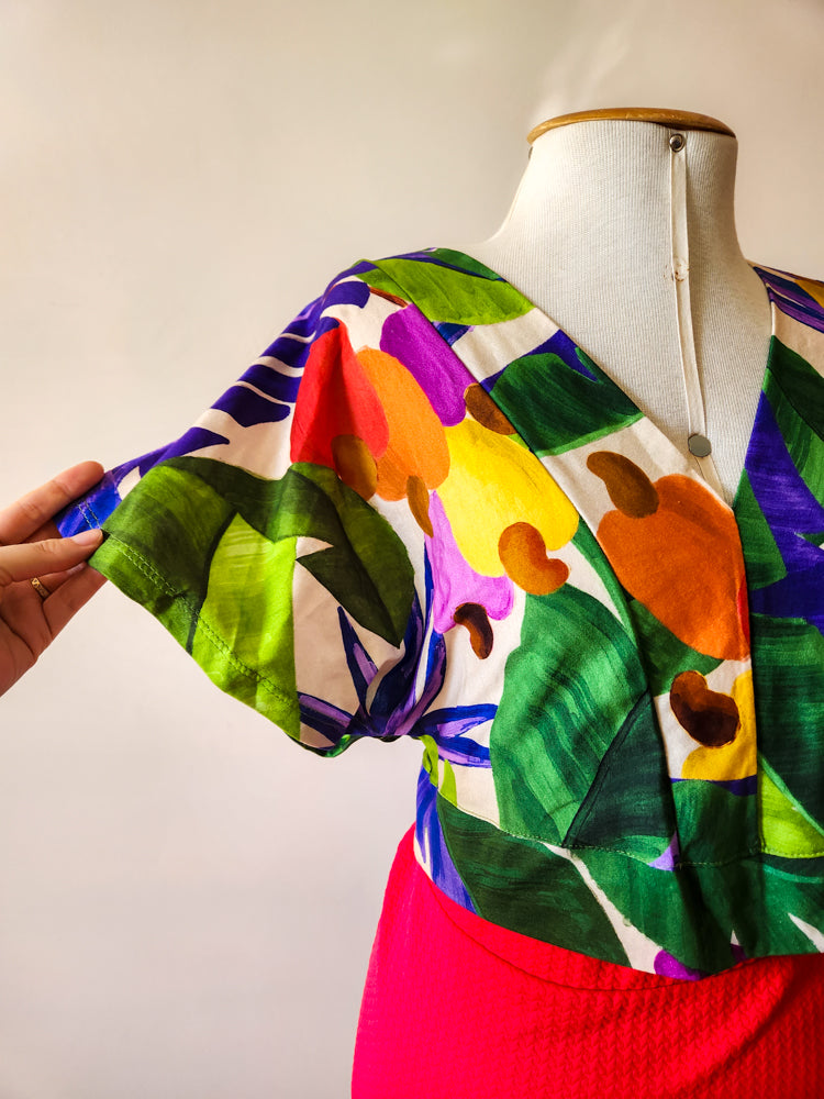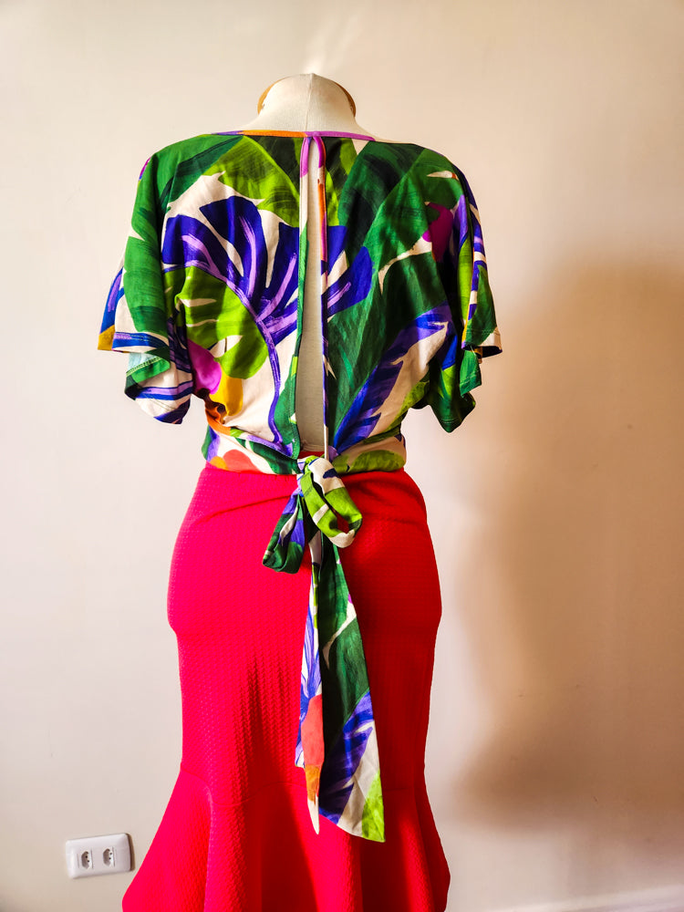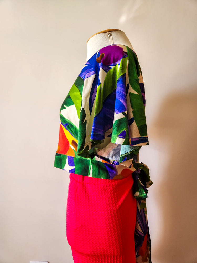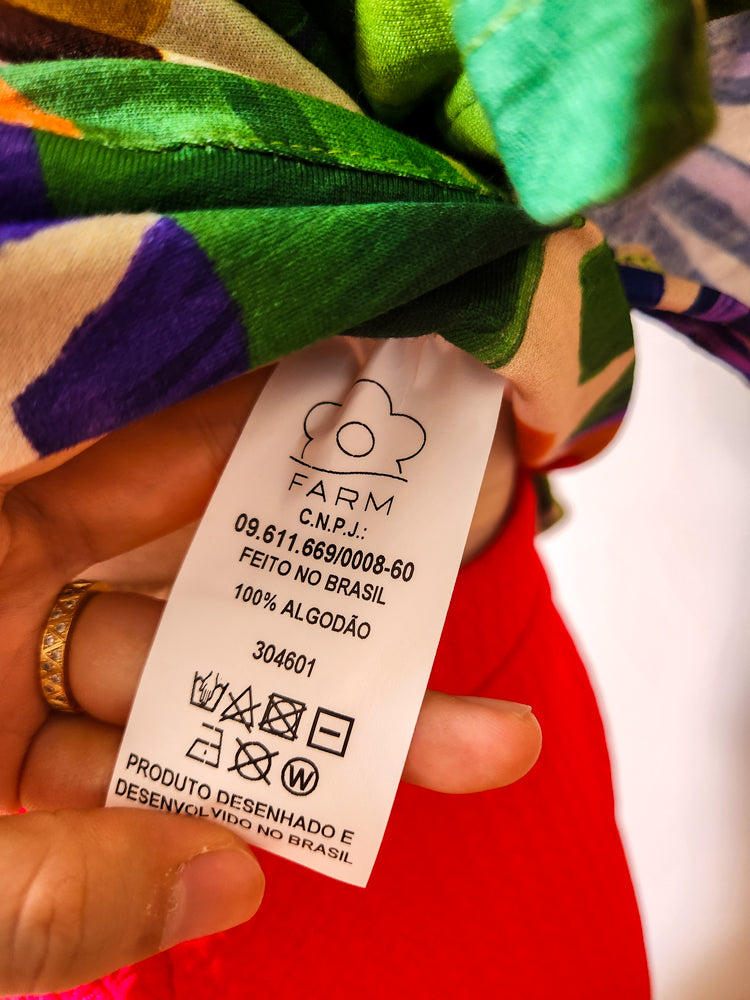 Cropped feminino da marca Farm, novo com tag. Modelo com estampa vibrante de cajus e folhagens em tons tropicais. Possui mangas amplas, decote em V, amarração na cintura e abertura posterior. Confeccionado em algodão, é leve, fresco e ideal para dias mais quentes.