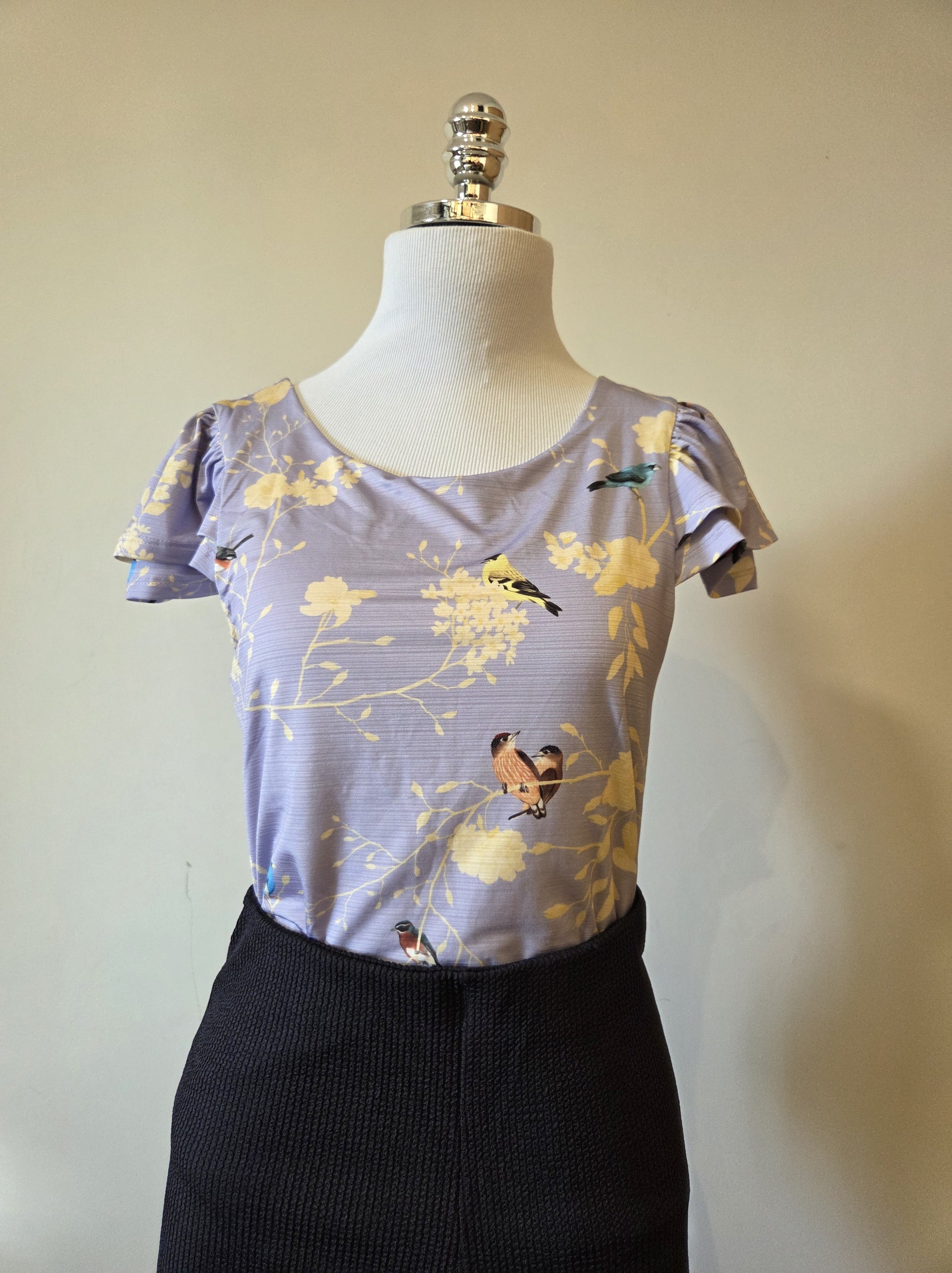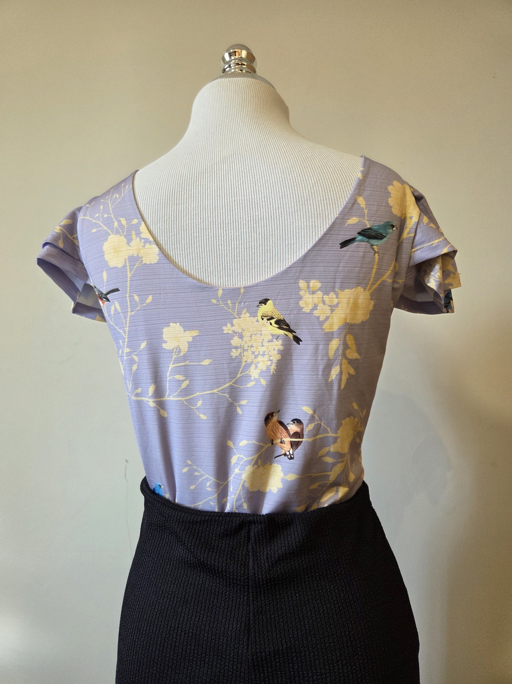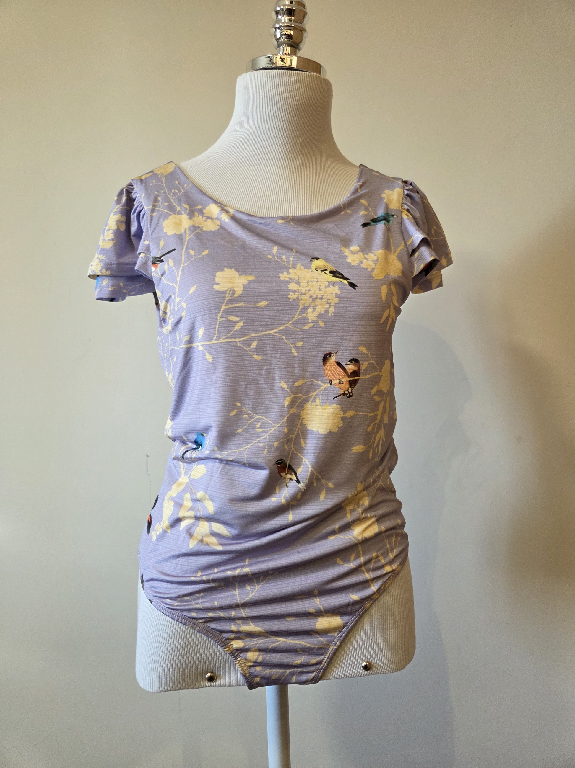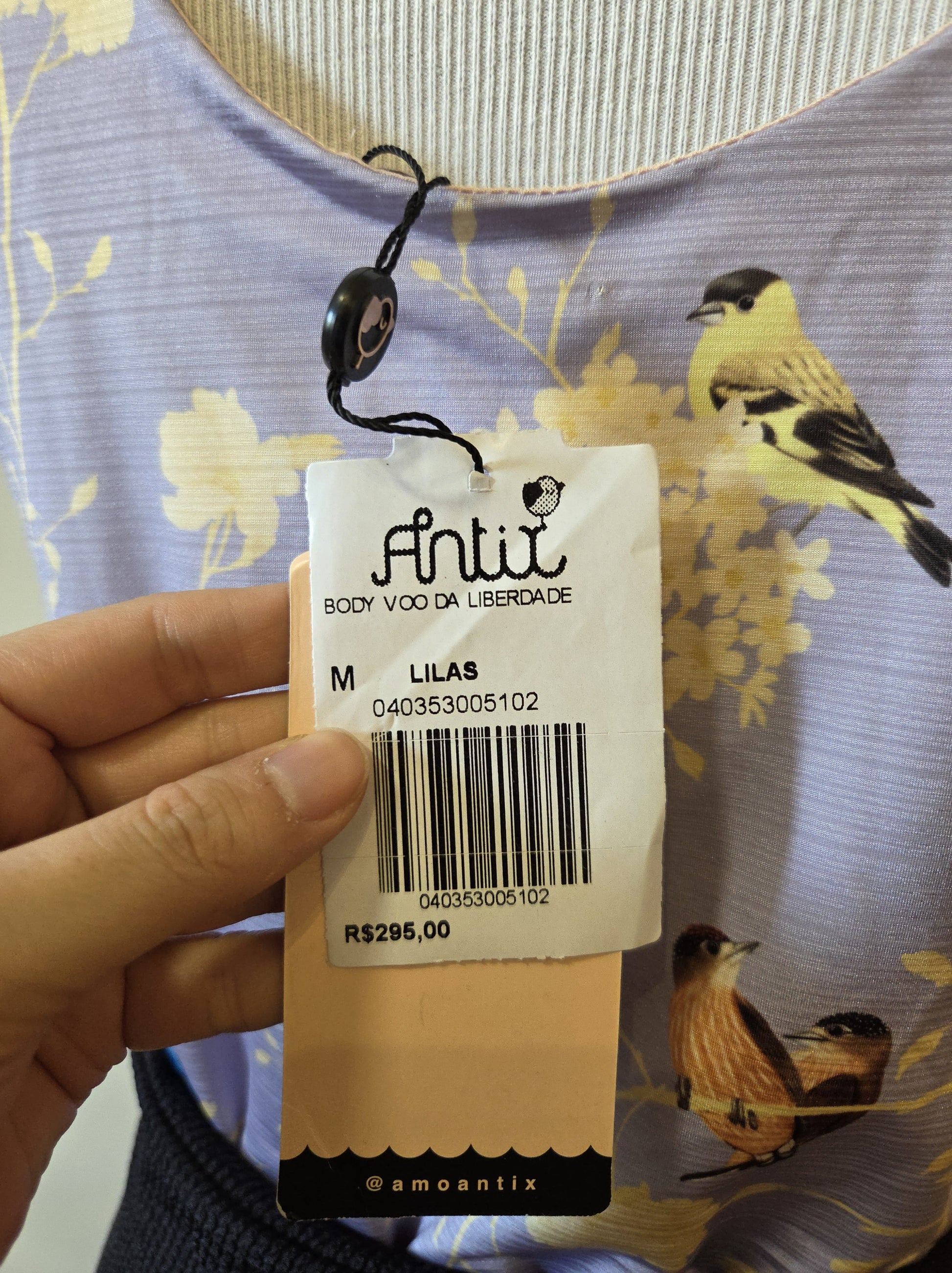 A estampa exclusiva da Antix é o grande destaque: um fundo em tom de azul claro com um padrão floral e galhos, e diversos pássaros coloridos discretamente espalhados pela peça. O design possui decote redondo e mangas curtas estilo meia cava com sobreposição, que adicionam um toque romântico. O fechamento é prático, com ganchos (botões de pressão) na parte inferior, facilitando o uso.