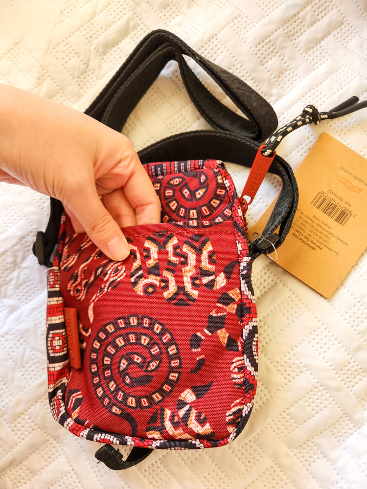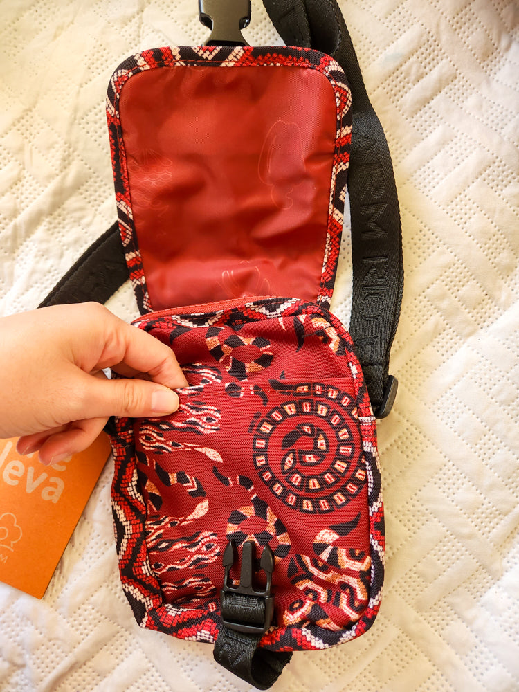Bolsa Crossbody Farm, modelo compacto e funcional, com estampa de animal print de cobra. Possui alça larga ajustável com a escrita "Farm Rio" em relevo, oferecendo conforto e estilo. Conta com duas divisórias principais com fechamento em zíper, além de bolso traseiro adicional. Fechamento frontal com encaixe plástico, garantindo mais segurança.