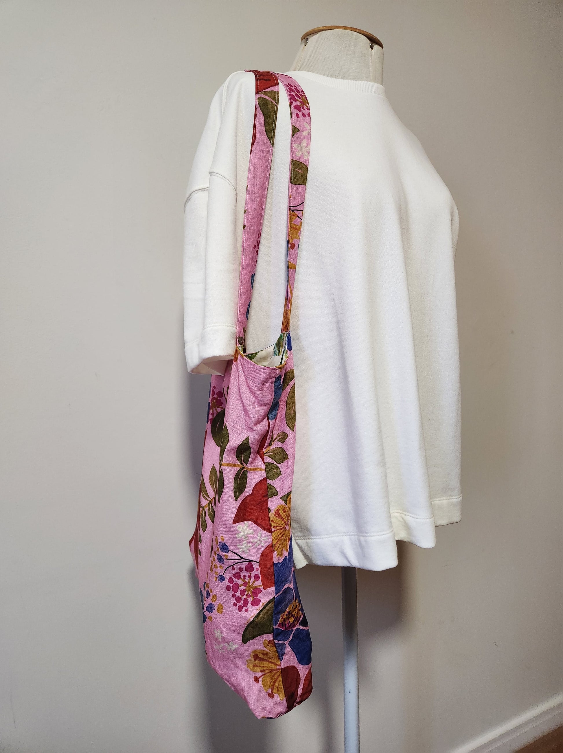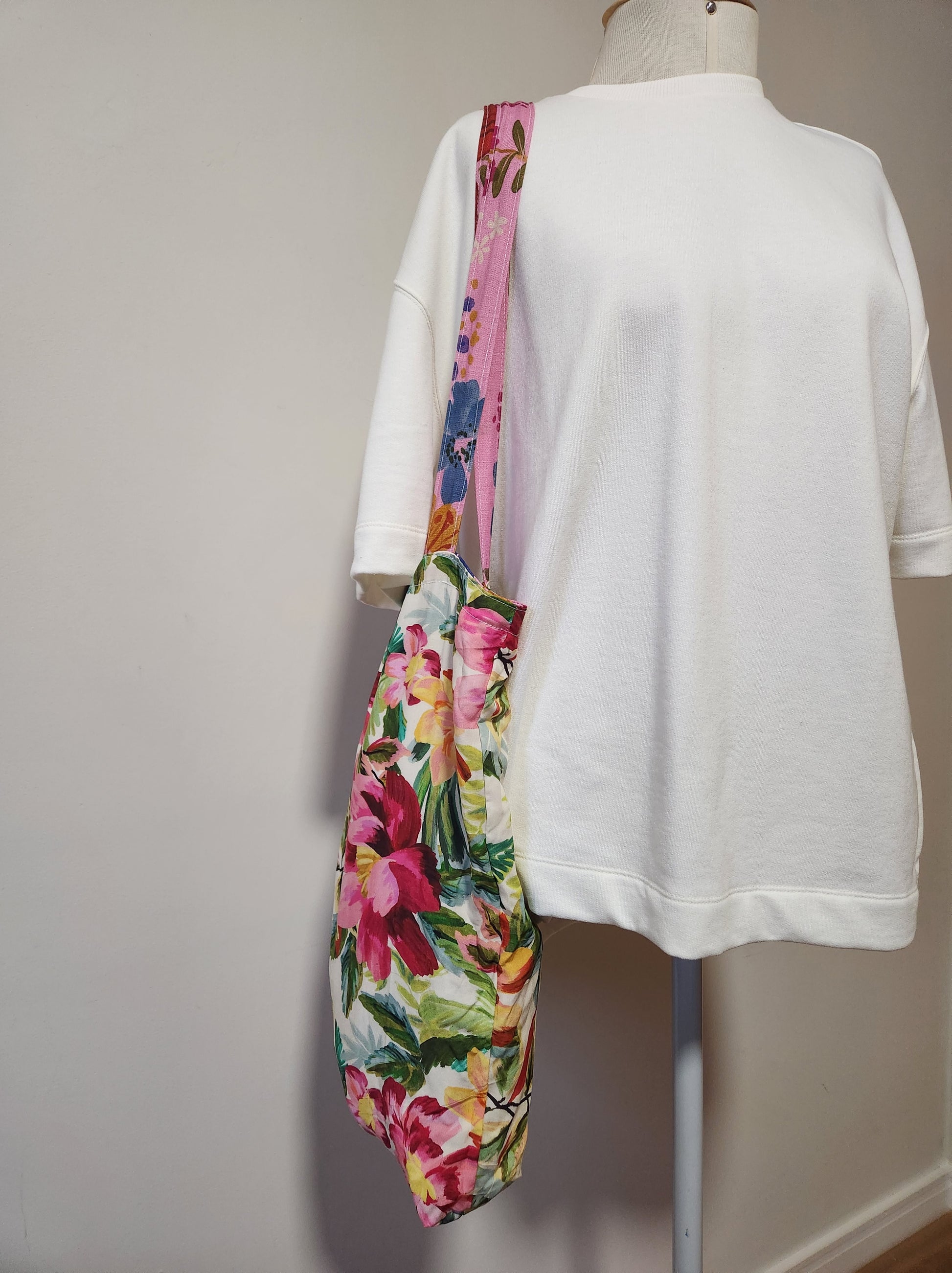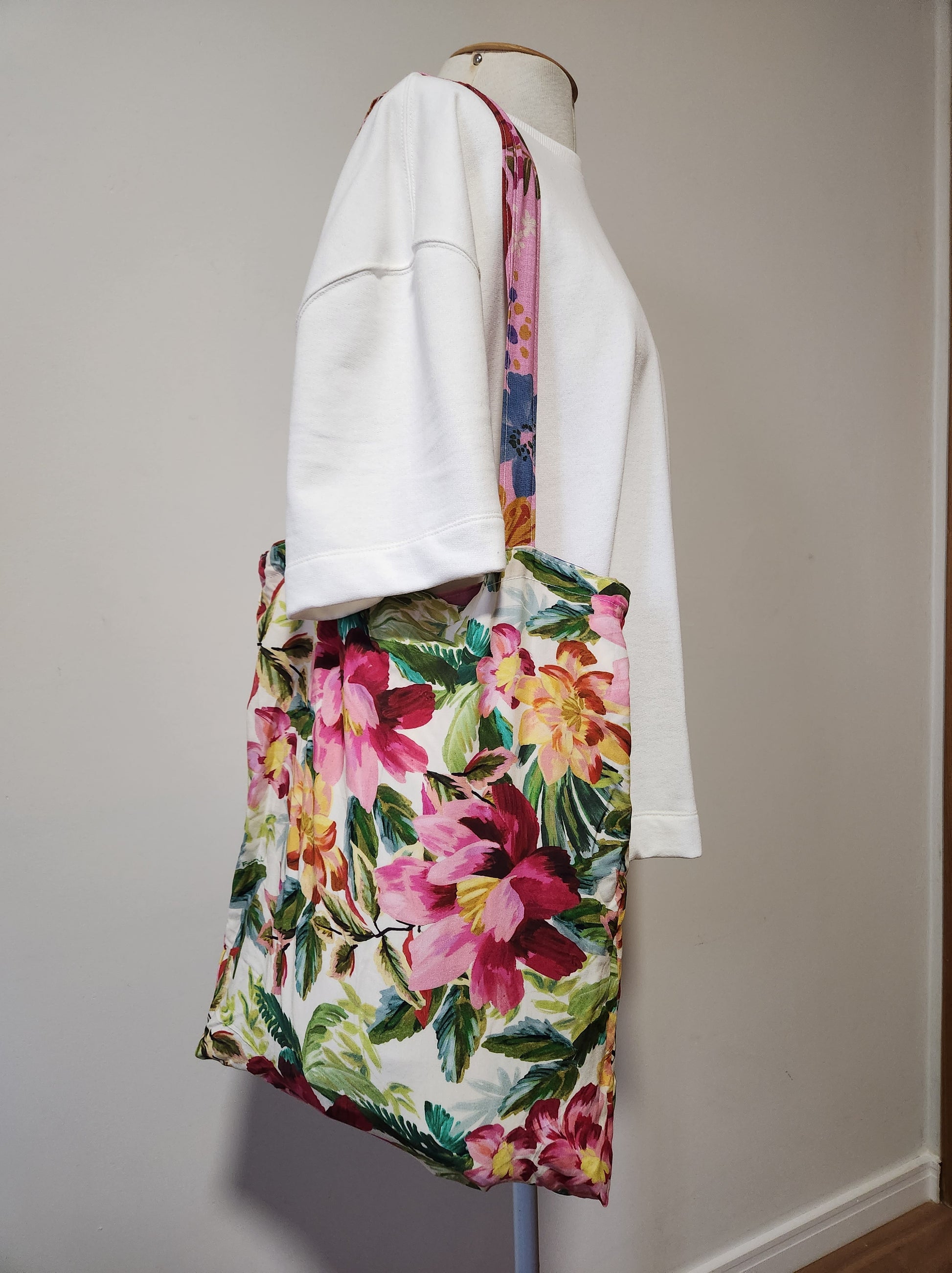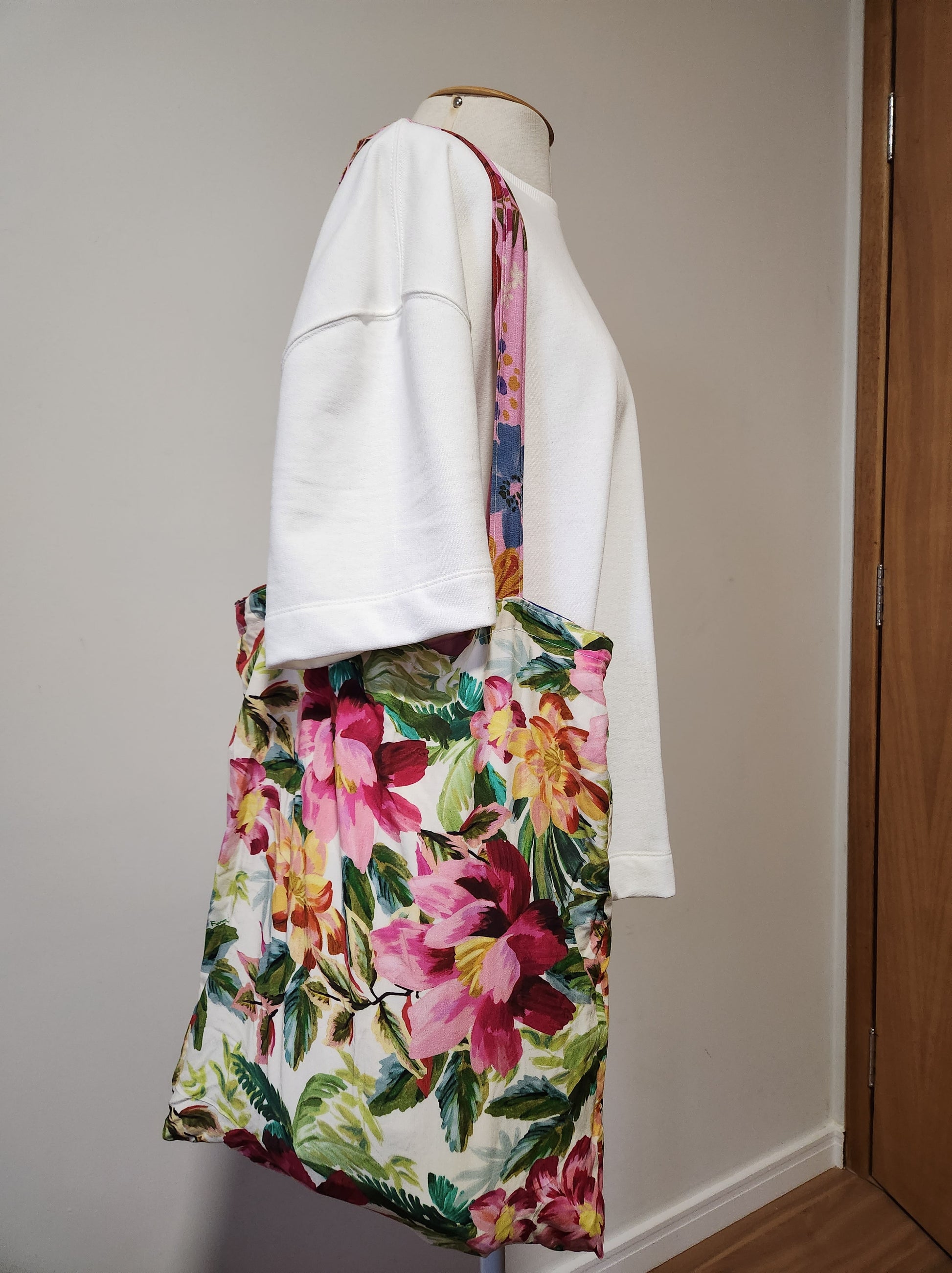 Um lado da bolsa apresenta uma estampa floral exuberante com grandes flores em tons de azul e vermelho sobre um fundo rosa (em tecido de viscolinho), que confere uma textura sutil e elegante. O outro lado é um vibrante mix de flores em tons de rosa e amarelo sobre um fundo branco (em tecido de viscose), proporcionando um caimento leve e macio.