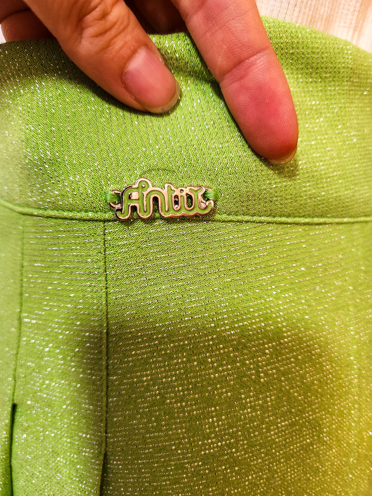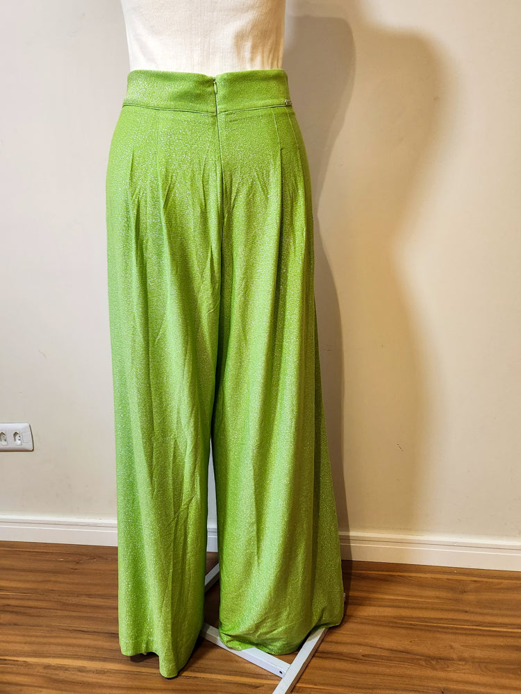 Calça feminina Antix, modelo Louco Amor, modelo pantalona em tom verde claro com brilho prateado sutil. Conta com bolsos laterais funcionais, detalhes em pregas frontais e fechamento por zíper invisível na lateral, trazendo elegância e sofisticação à peça.