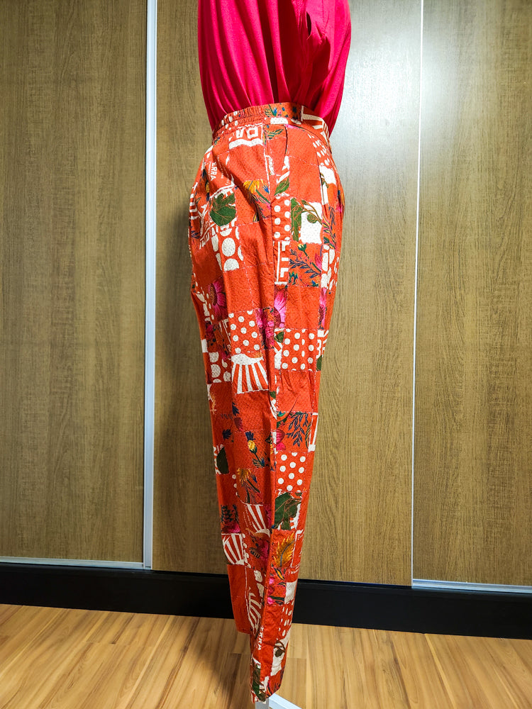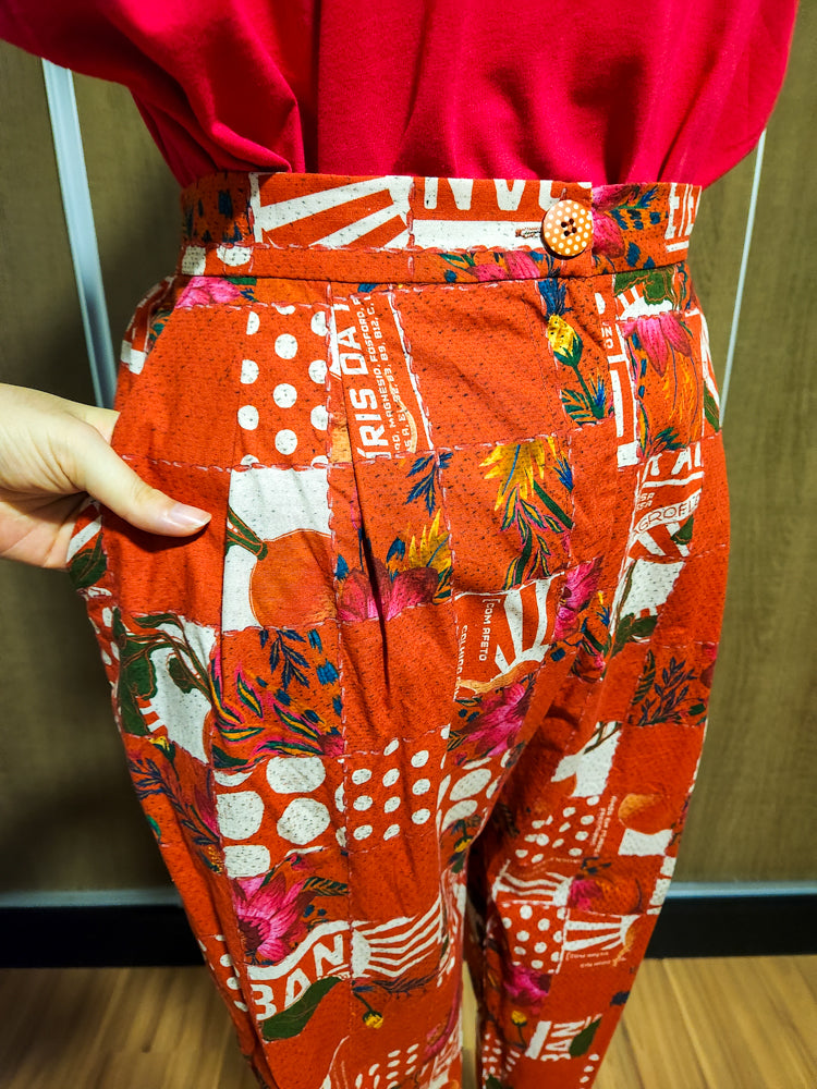 Cor/Estampa: Estampa vermelha com escritas, poás, frutas