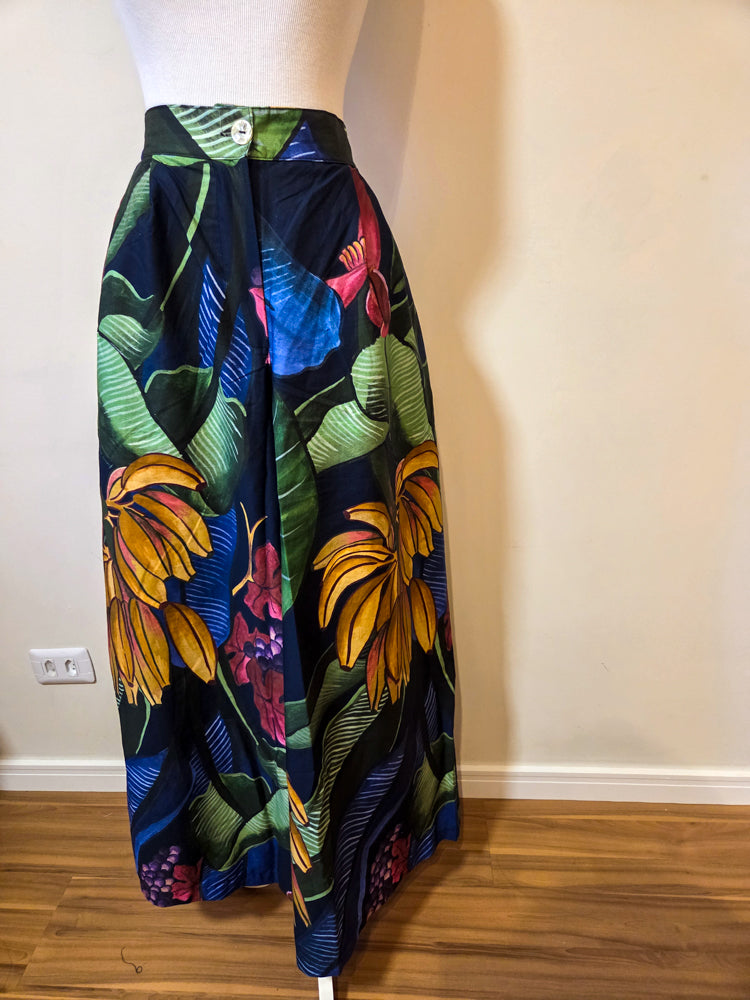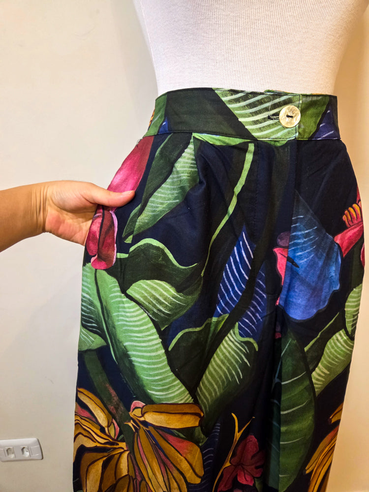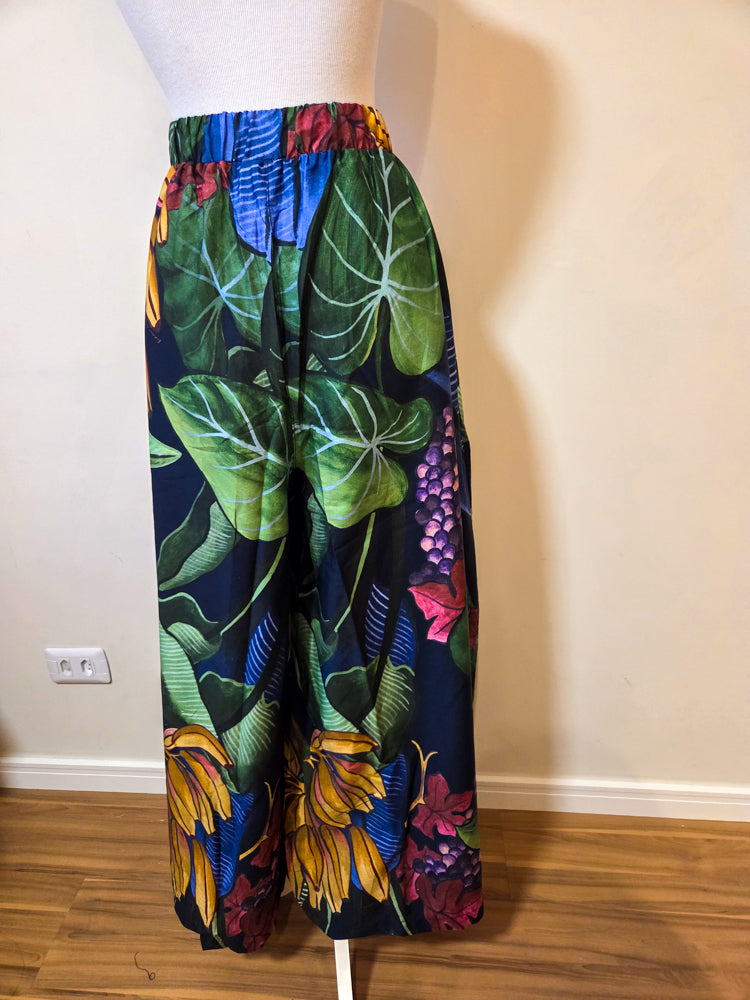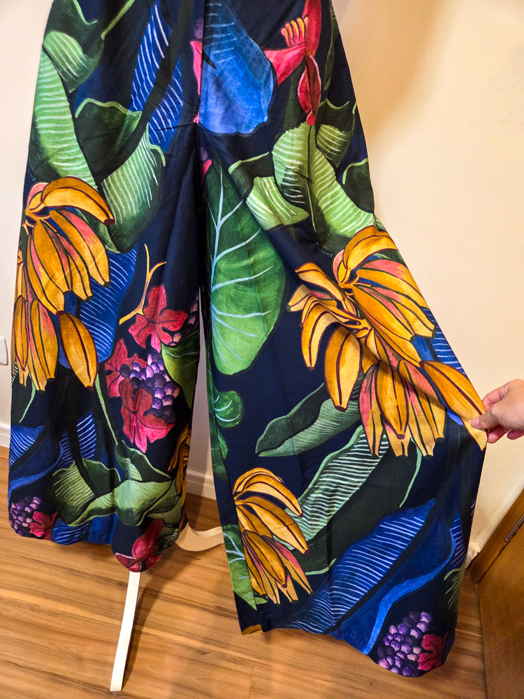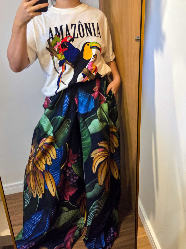 Pantalona fluida com estampa tropical vibrante "Come to Brazil", confeccionada em 100% viscose. Possui modelagem ampla e confortável, com caimento leve e cintura alta. Fechamento com botão e zíper frontal. Ideal para looks de verão com personalidade.