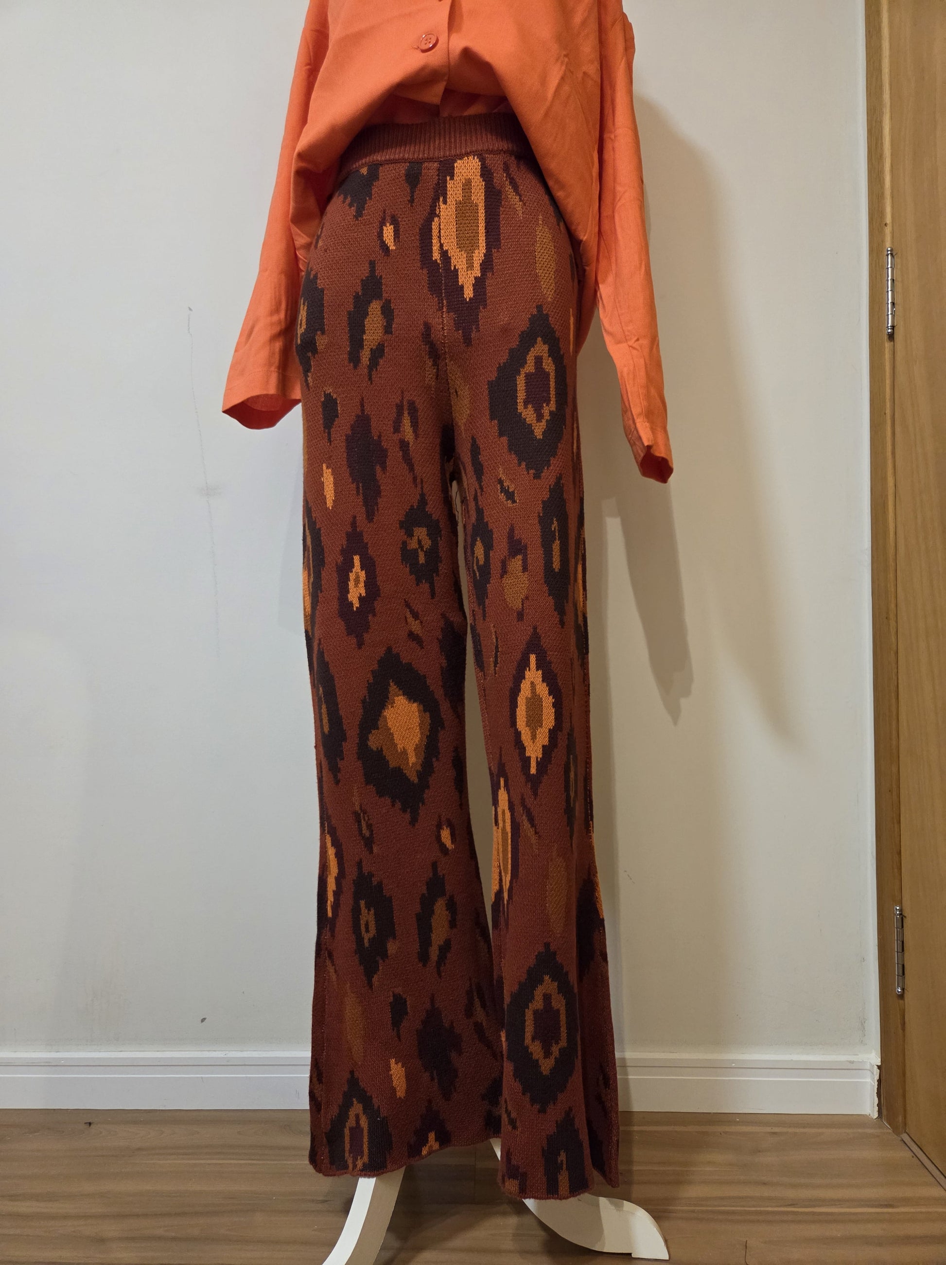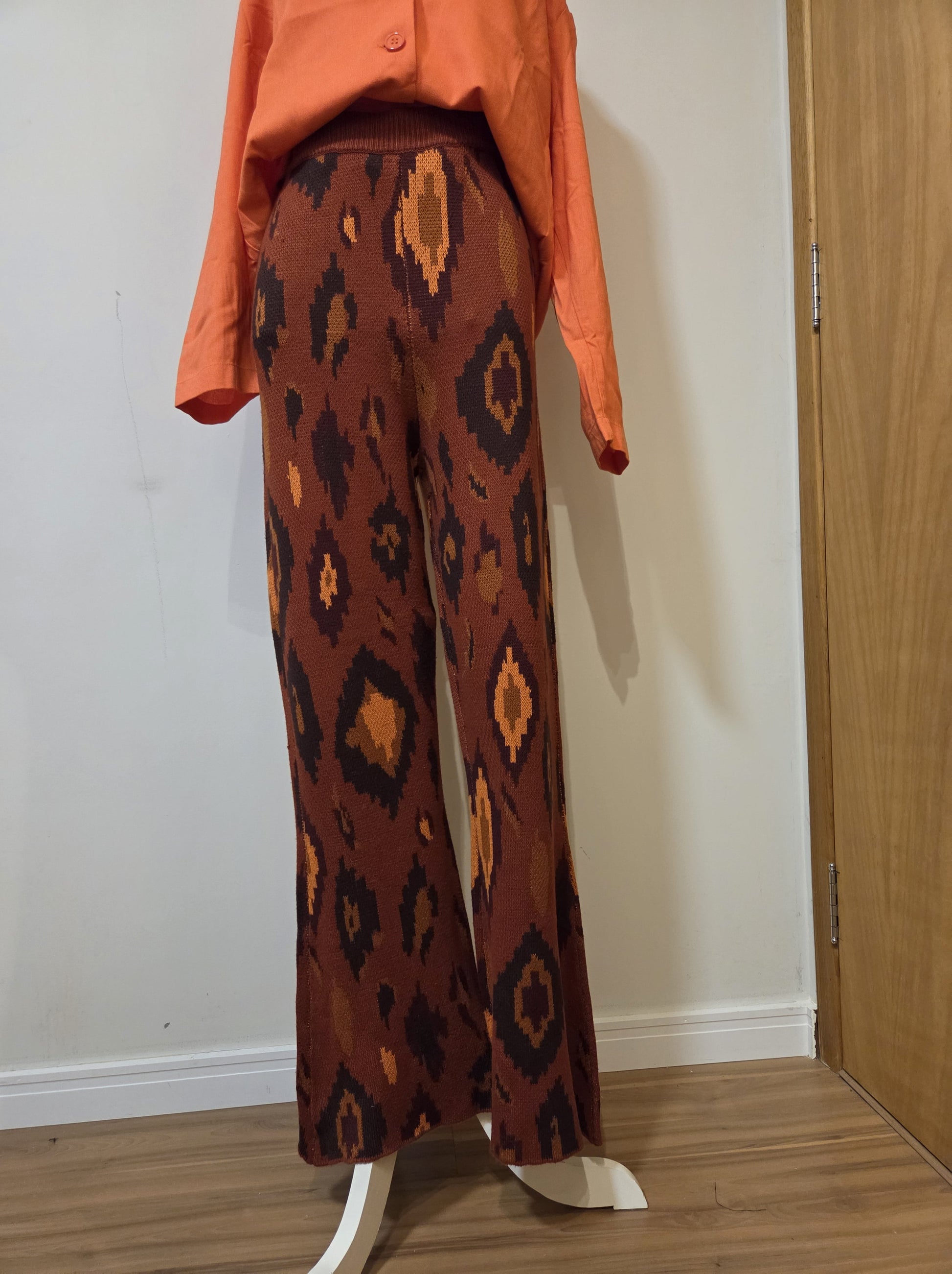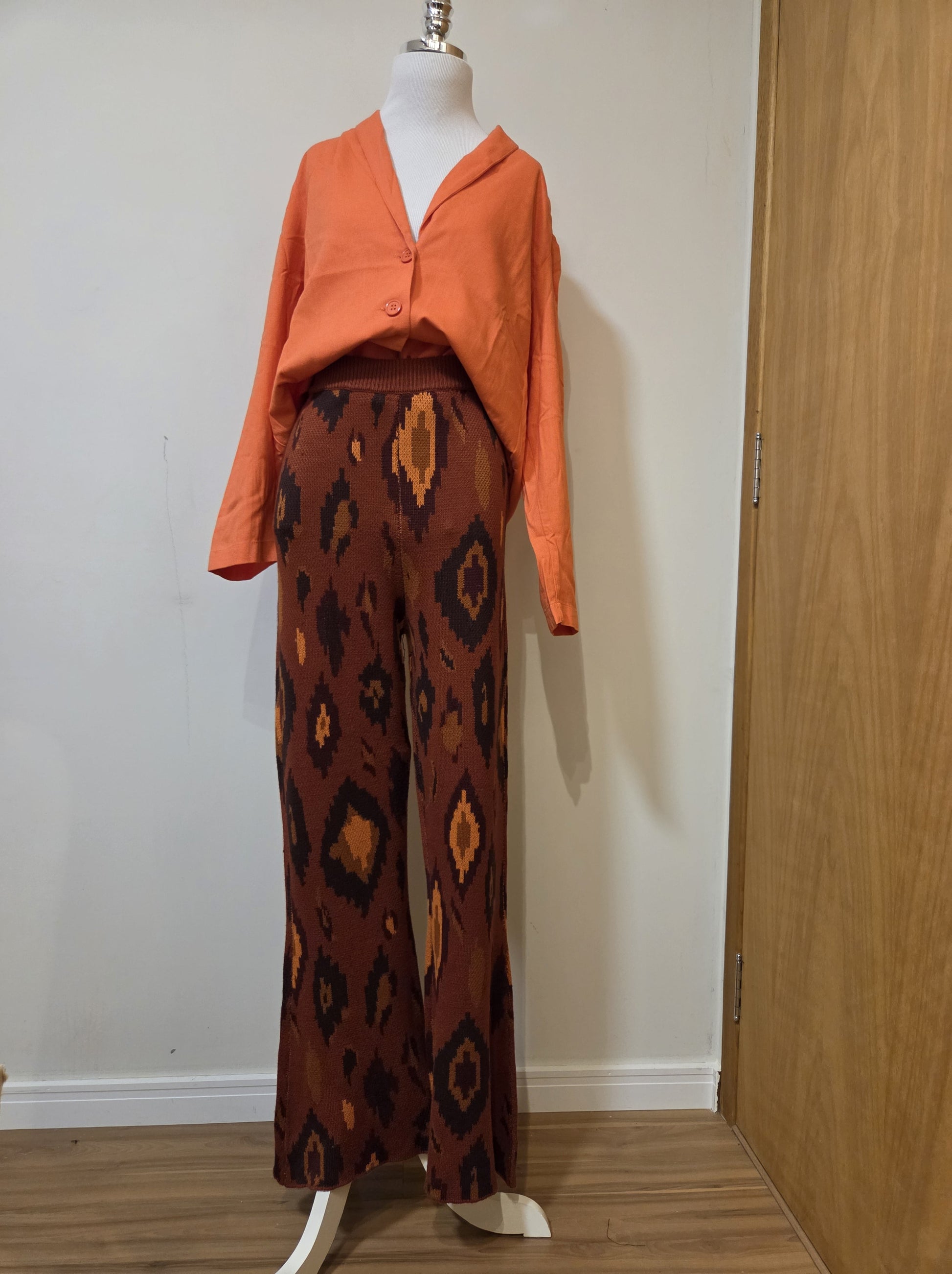 A peça se destaca por sua estampa geométrica/abstrata, que remete a padrões étnicos ou animais, em uma paleta de cores terrosas: diferentes tons de marrom (incluindo marrom-escuro e terracota) e laranja, criando um visual sofisticado e original.