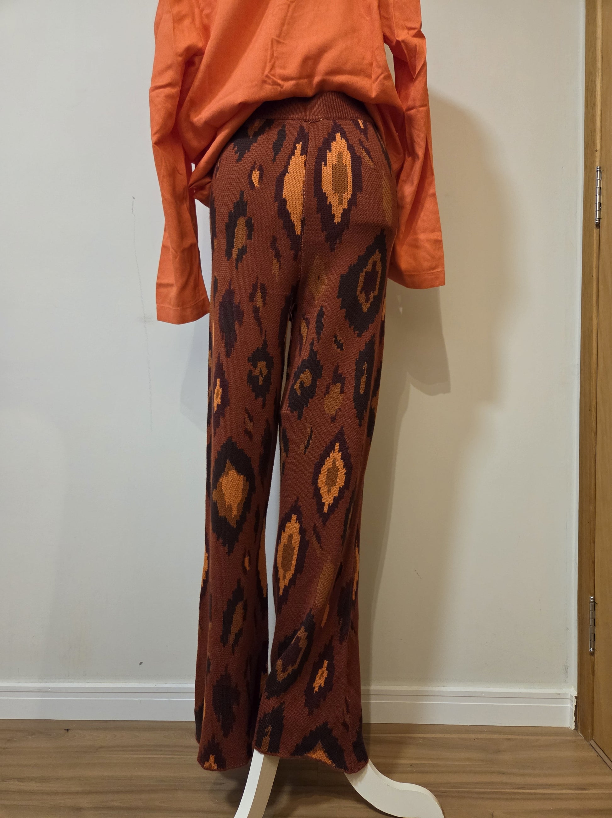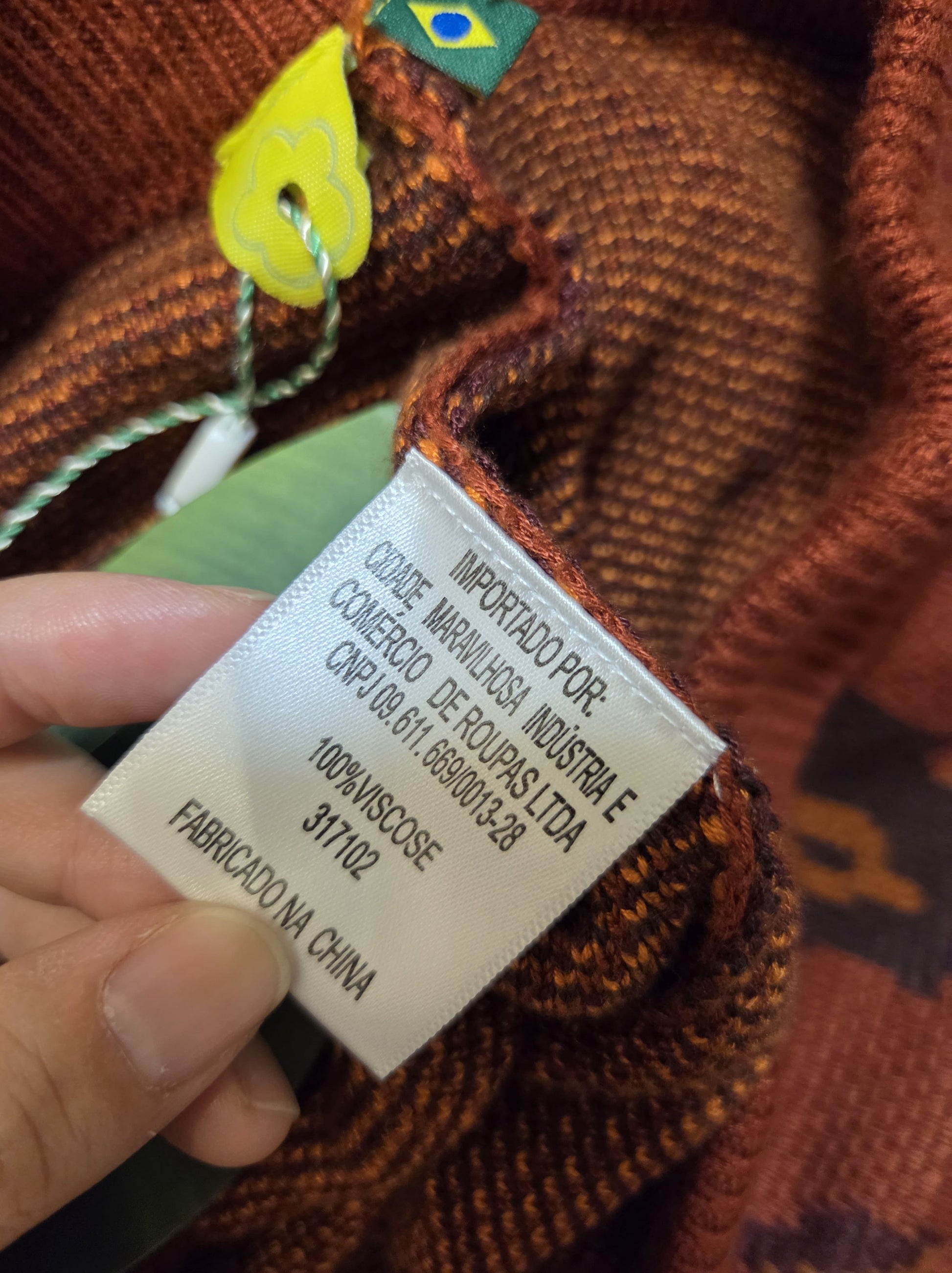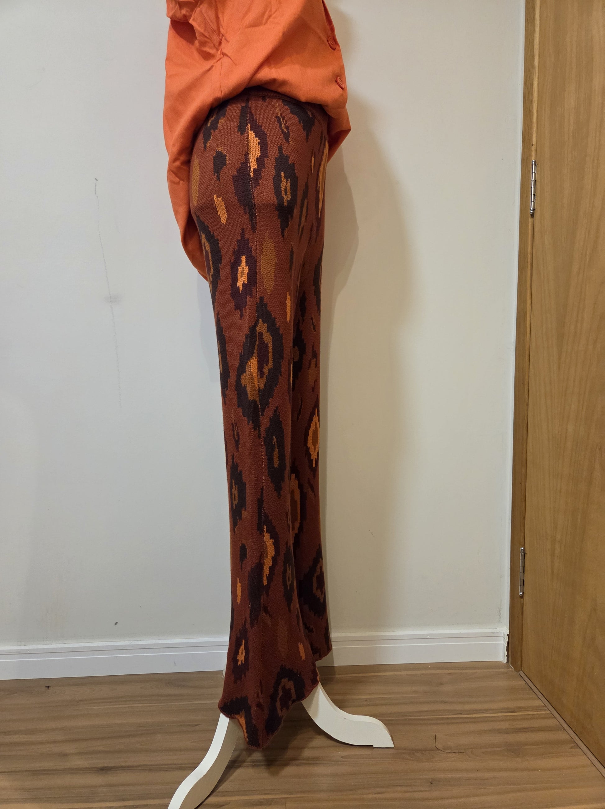 A peça se destaca por sua estampa geométrica/abstrata, que remete a padrões étnicos ou animais, em uma paleta de cores terrosas: diferentes tons de marrom (incluindo marrom-escuro e terracota) e laranja, criando um visual sofisticado e original.