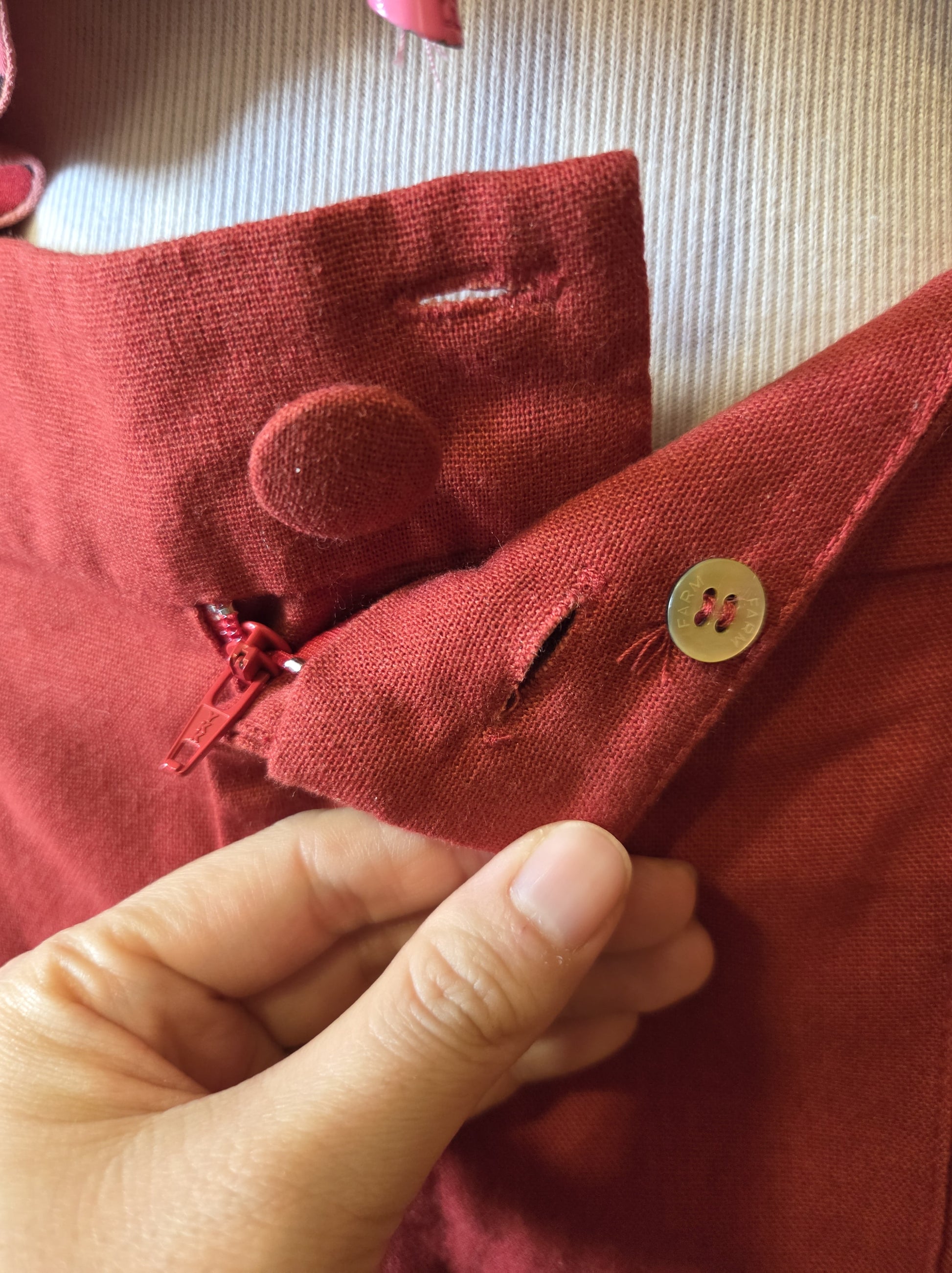 Fechamento: Zíper e botões frontais (um encapado, um interno)