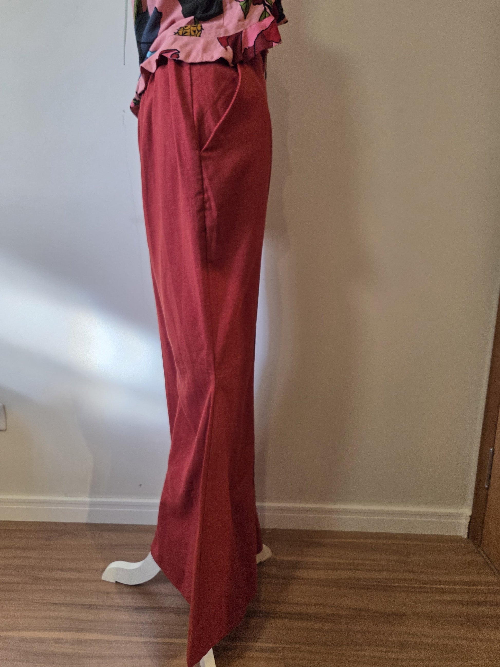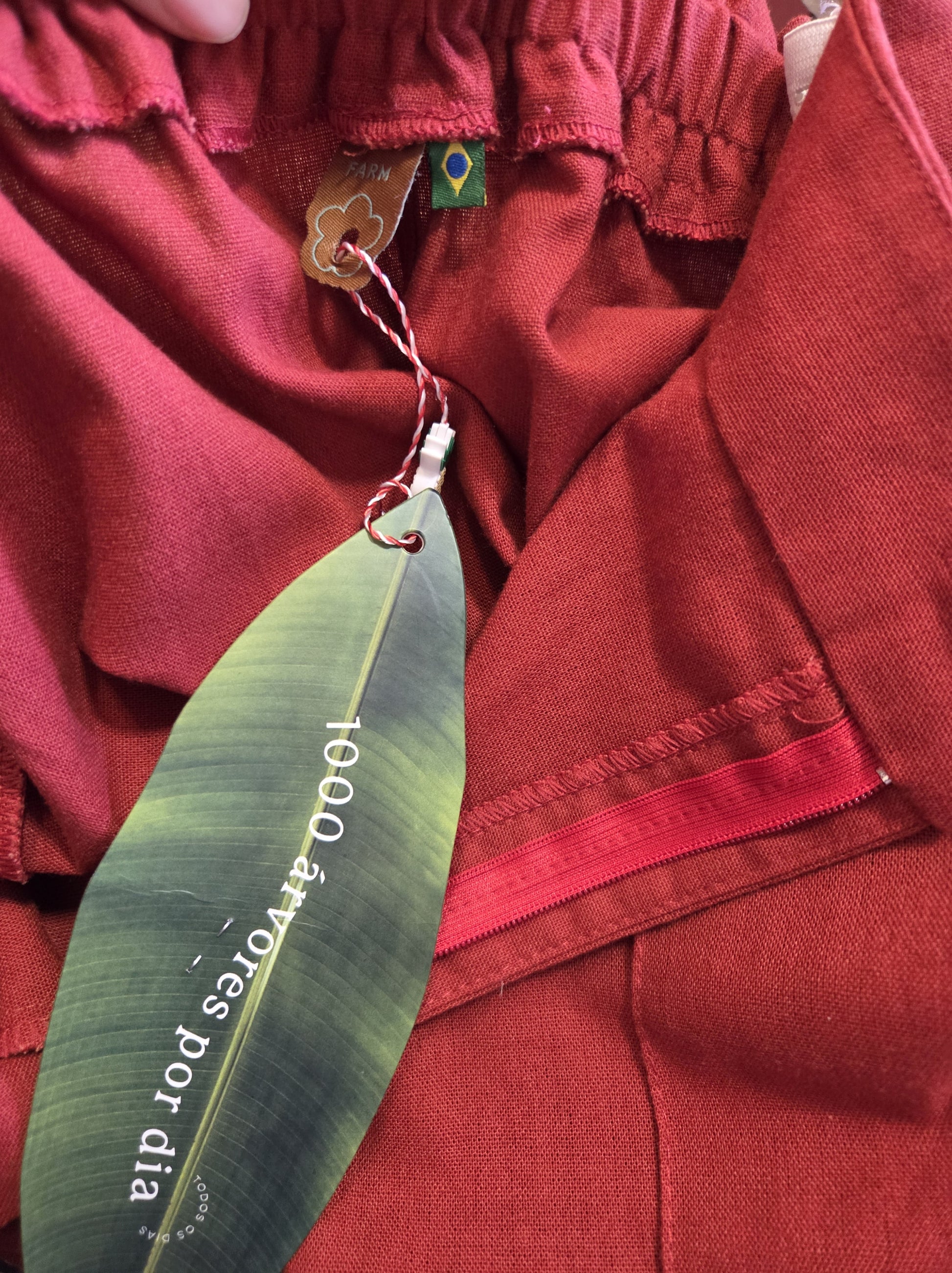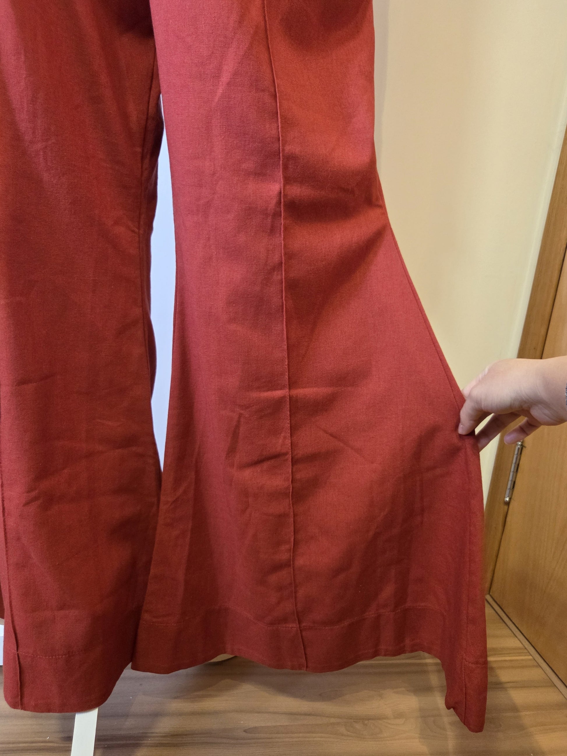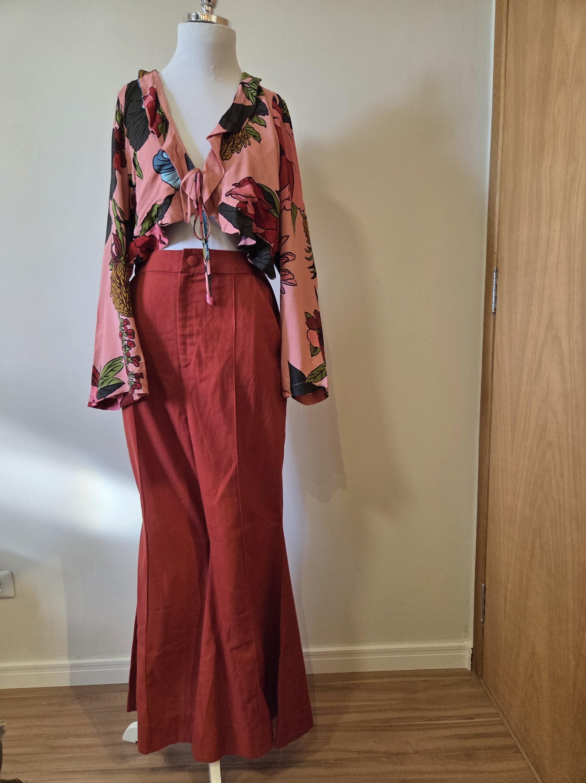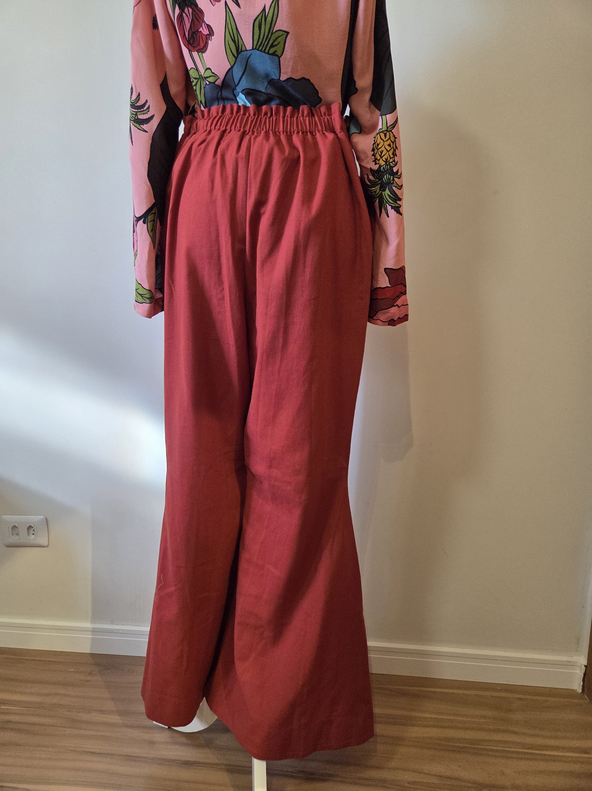 Calça feminina da marca Farm, esta peça elegante e confortável apresenta a cor "Vermelho Oeste", um tom terracota/laranja queimado sofisticado.