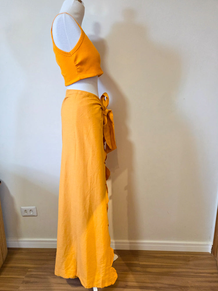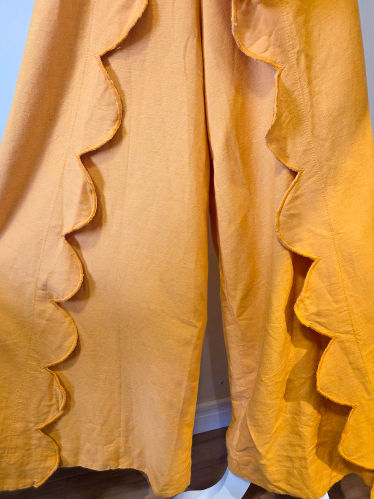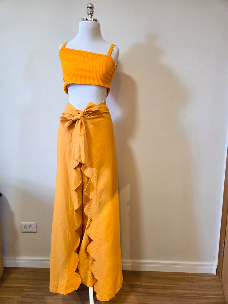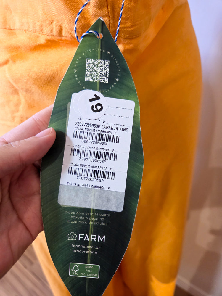 Calça feminina da marca Farm, seguindo o charmoso "modelo nuvem". Esta peça diferenciada possui um design transpassado (envelope) que cria um movimento fluido e elegante. O fechamento é feito através de uma amarração frontal com um laço delicado na cintura, que permite ajuste e adiciona um toque romântico.