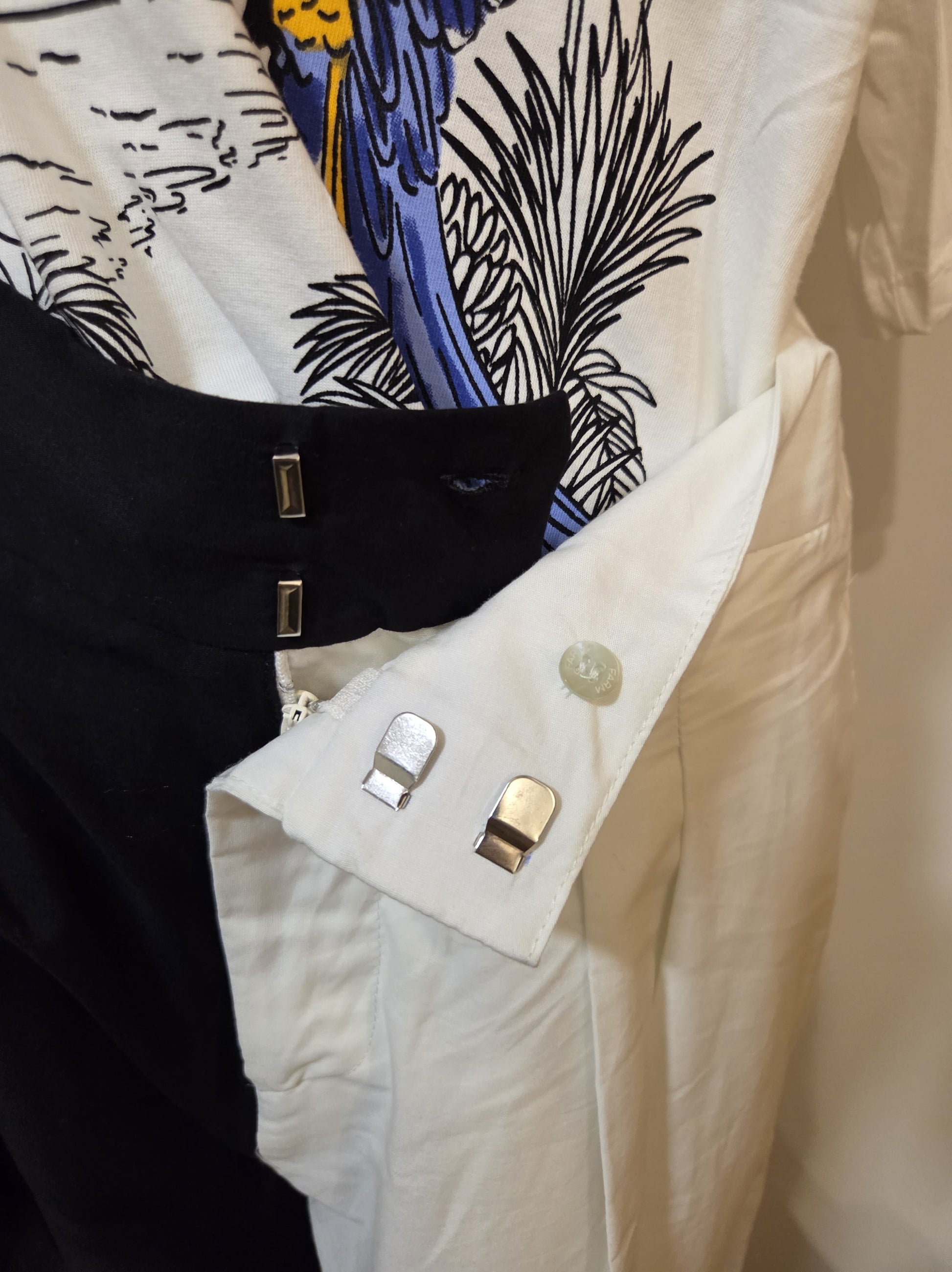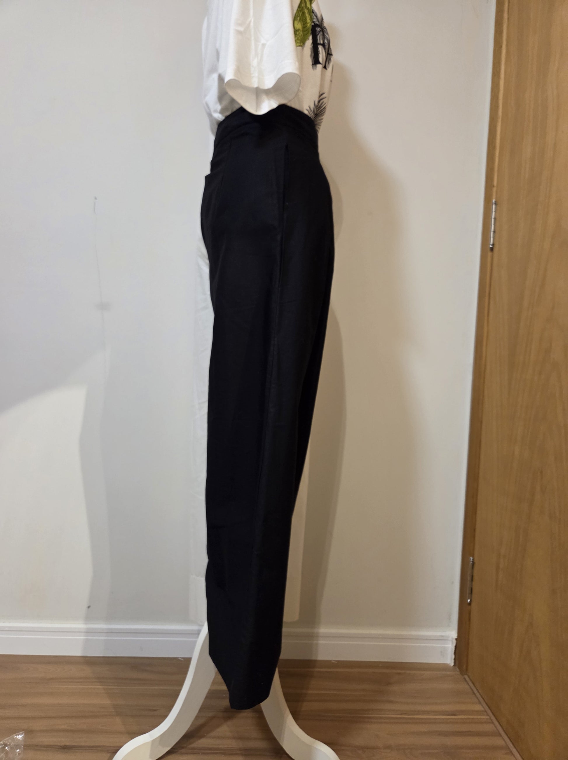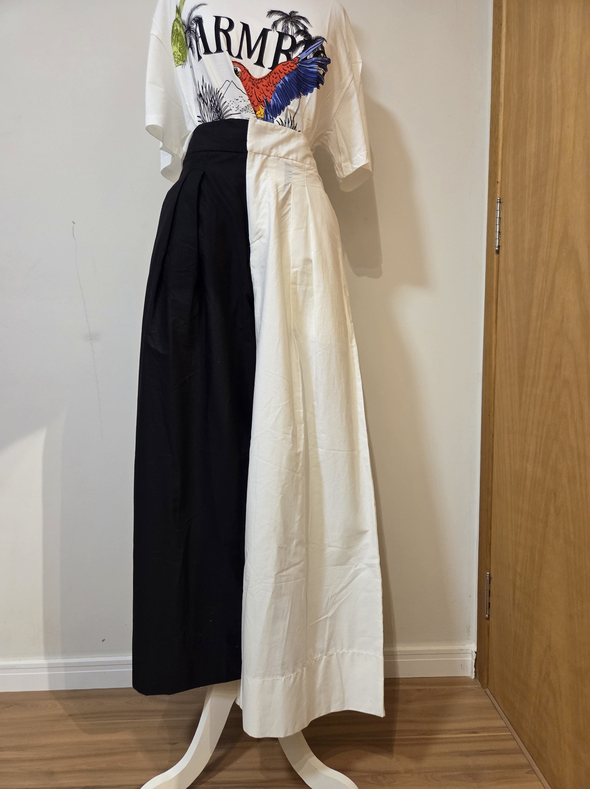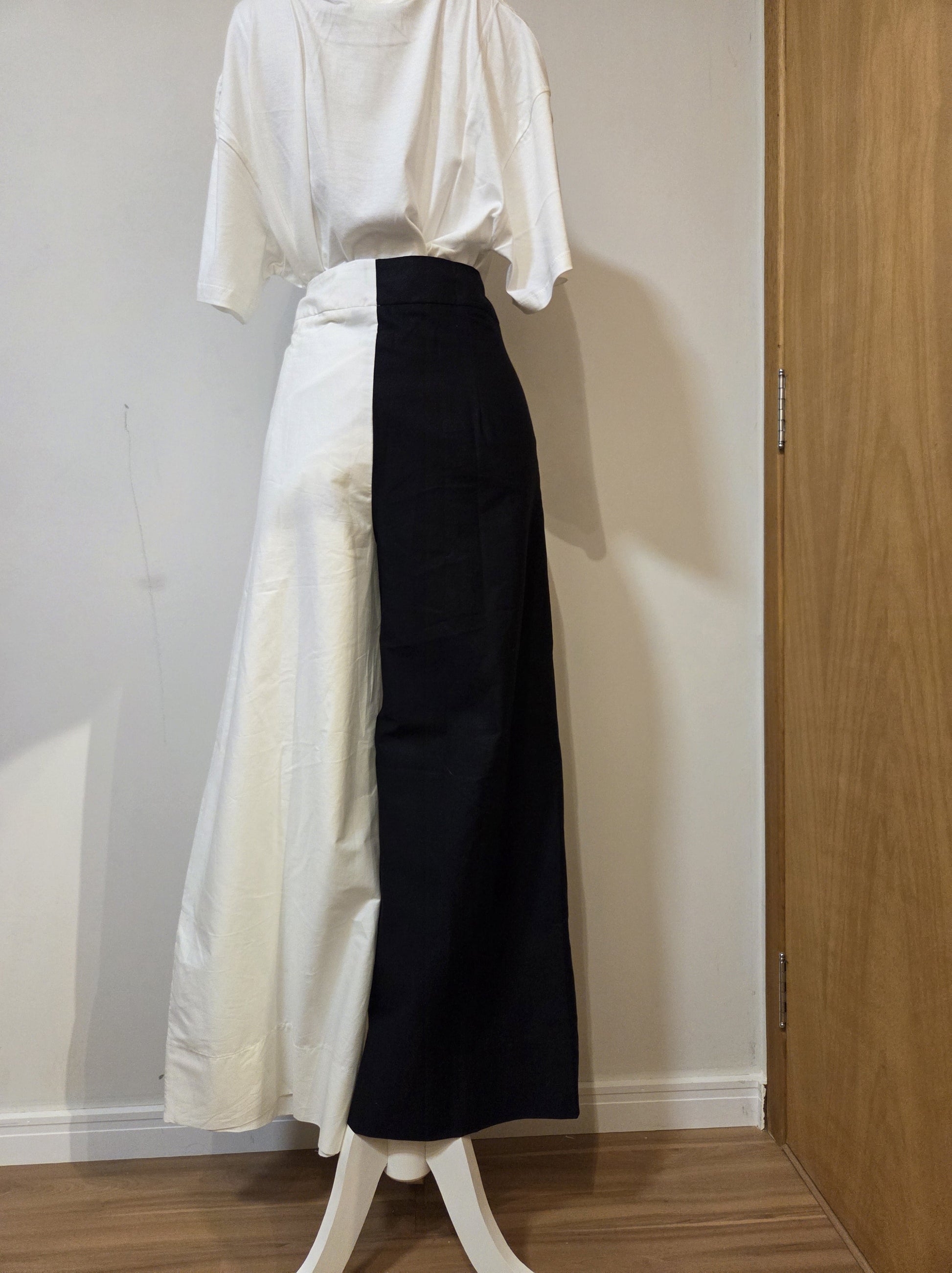 O grande destaque da peça é o seu design bicolor e assimétrico: uma perna preta e a outra em elegante branca. O modelo é pantalona, com pernas amplas que garantem movimento e sofisticação. Possui bolsos laterais funcionais para maior praticidade. O fechamento é discreto e seguro, com zíper, botão interno e ganchos (colchetes de metal, como mostrado na imagem detalhada), garantindo um ajuste perfeito na cintura.