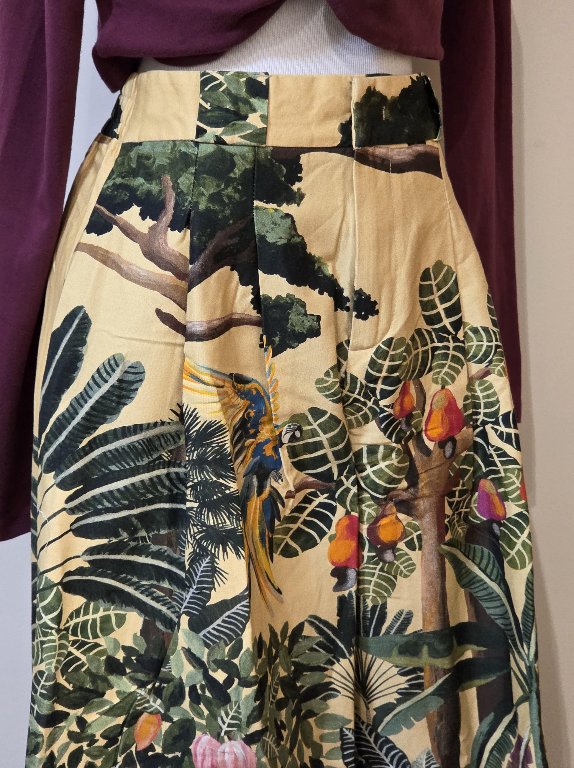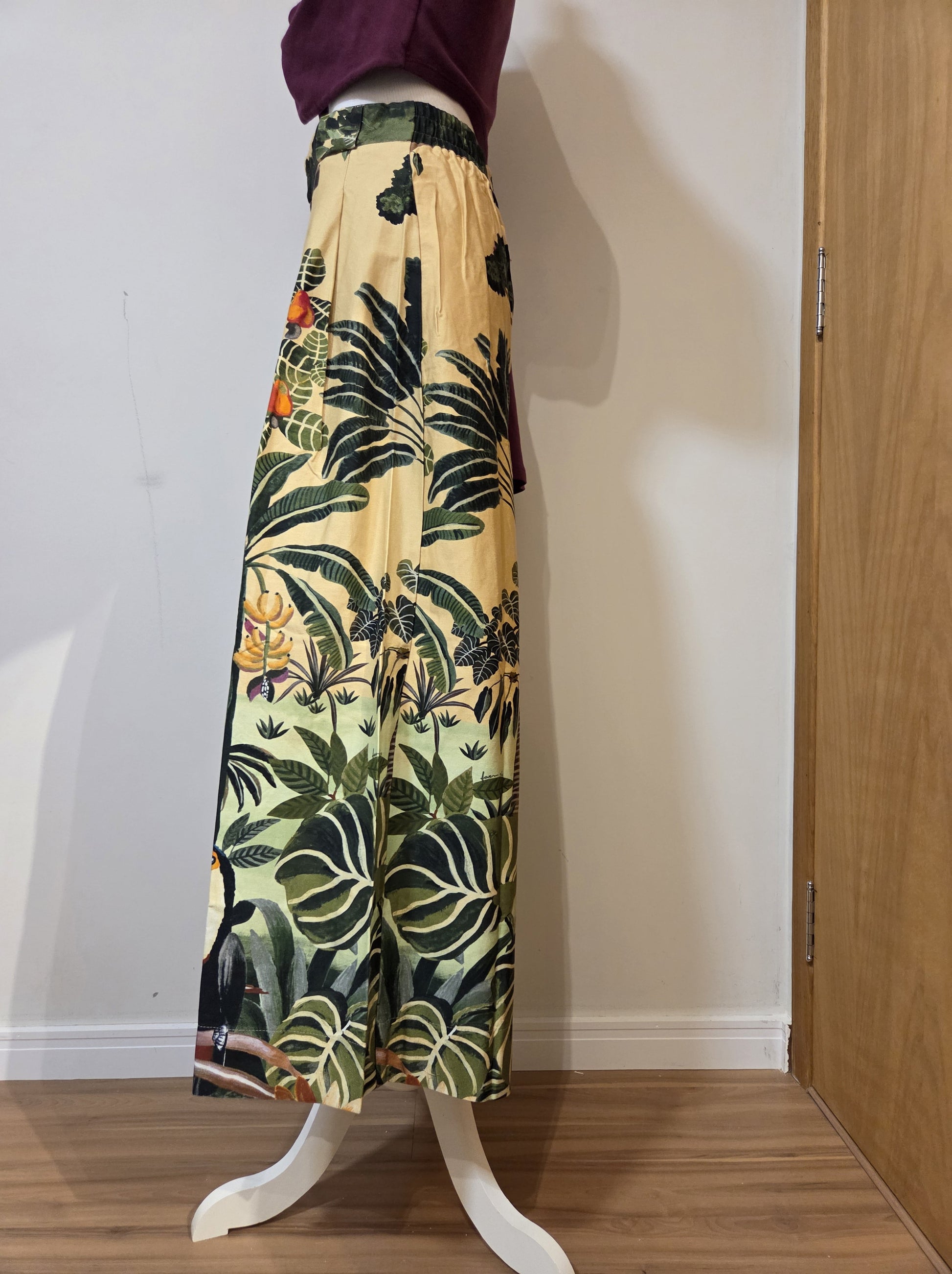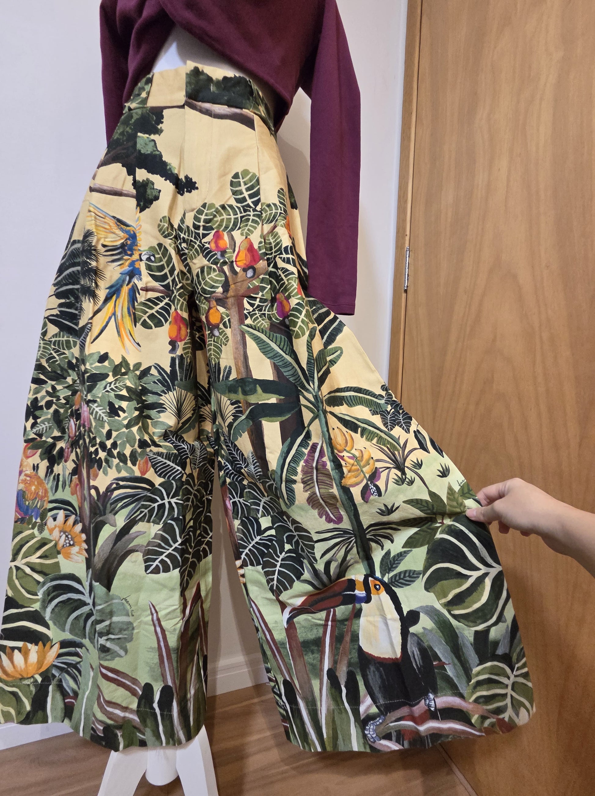 O grande destaque da peça é a estampa exclusiva "Mata Tropical", que celebra a exuberância da flora e fauna brasileira. A ilustração detalhada apresenta árvores, folhagens, frutas tropicais, e aves como araras e tucanos, tudo em uma rica paleta de tons de verde, marrom e amarelo claro (o fundo da calça), com toques de azul, laranja e vermelho.