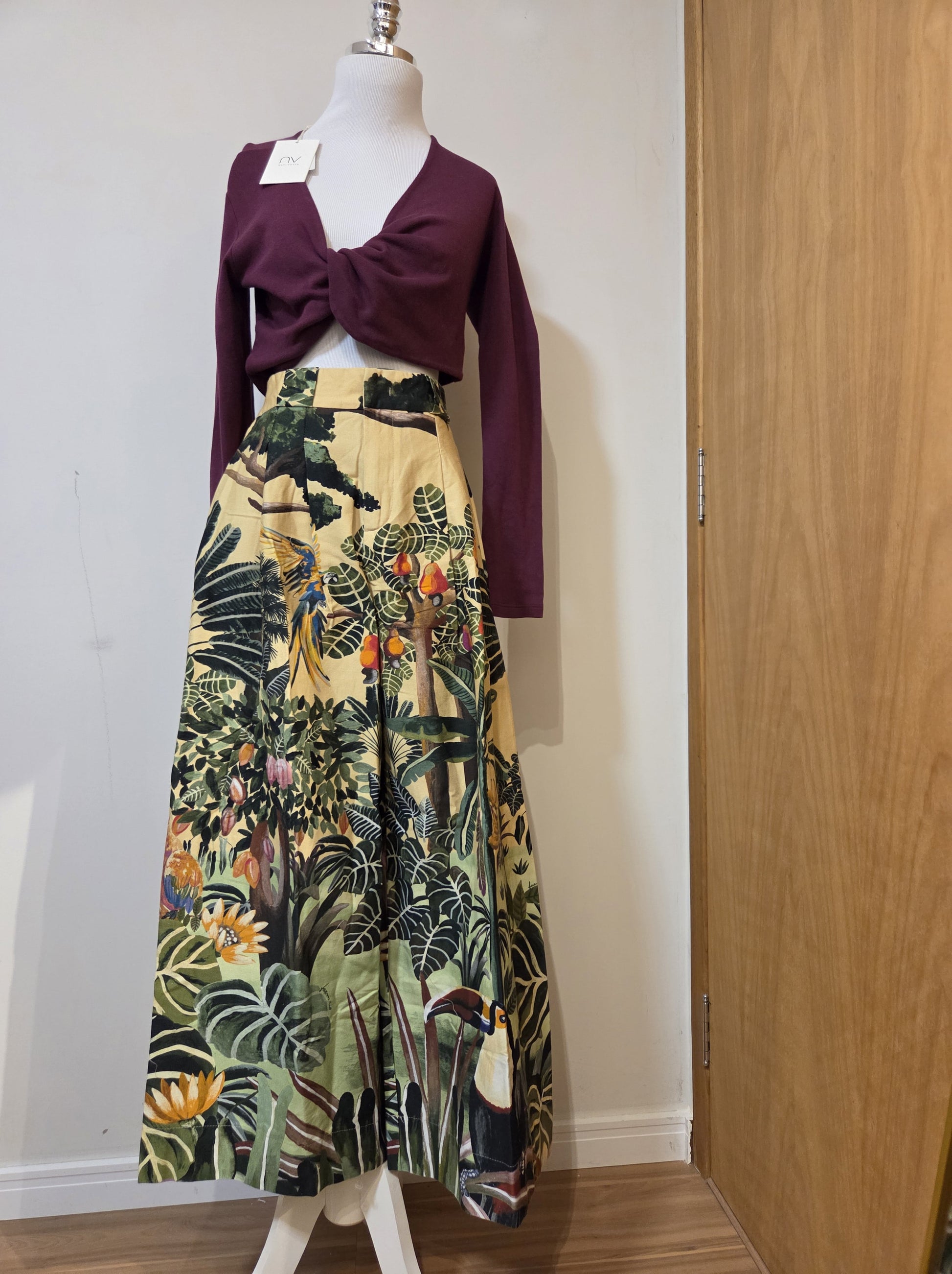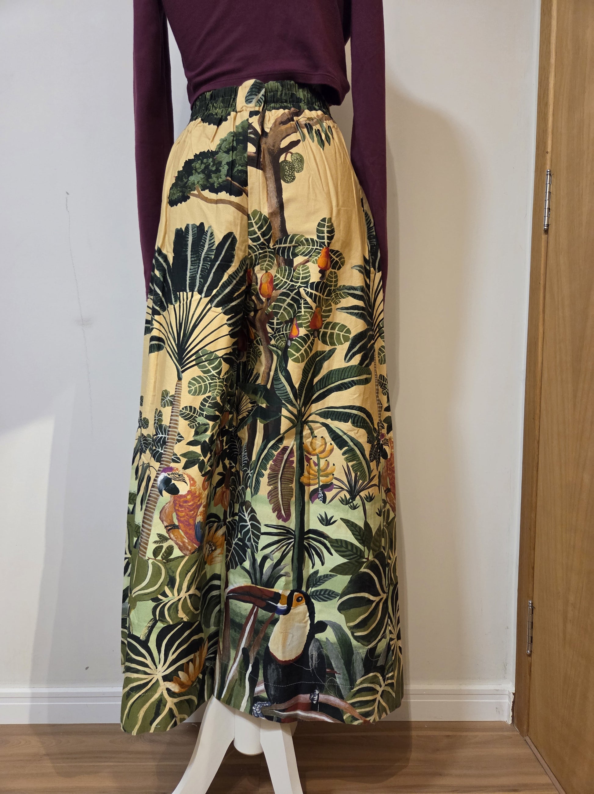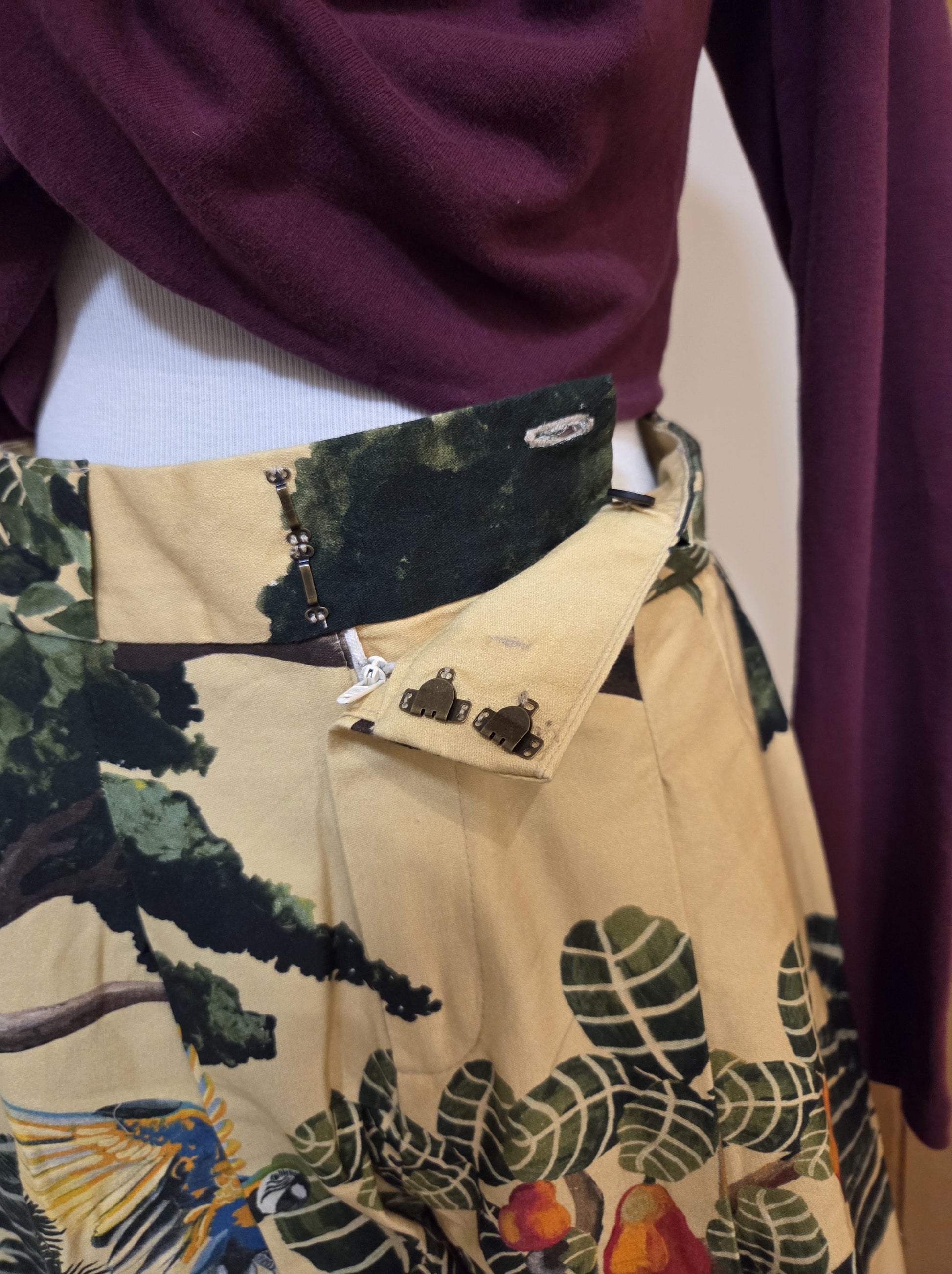 O grande destaque da peça é a estampa exclusiva "Mata Tropical", que celebra a exuberância da flora e fauna brasileira. A ilustração detalhada apresenta árvores, folhagens, frutas tropicais, e aves como araras e tucanos, tudo em uma rica paleta de tons de verde, marrom e amarelo claro (o fundo da calça), com toques de azul, laranja e vermelho.