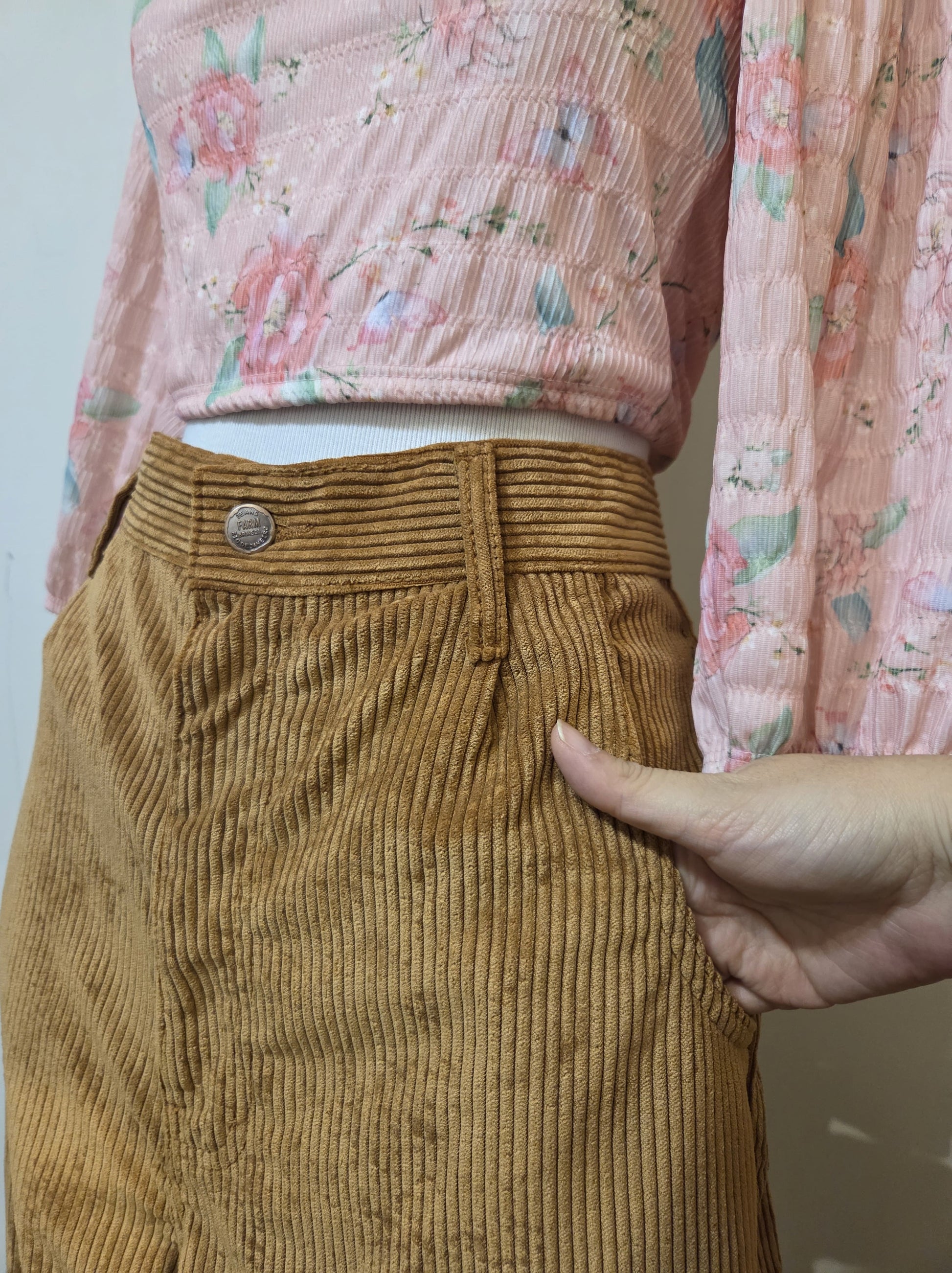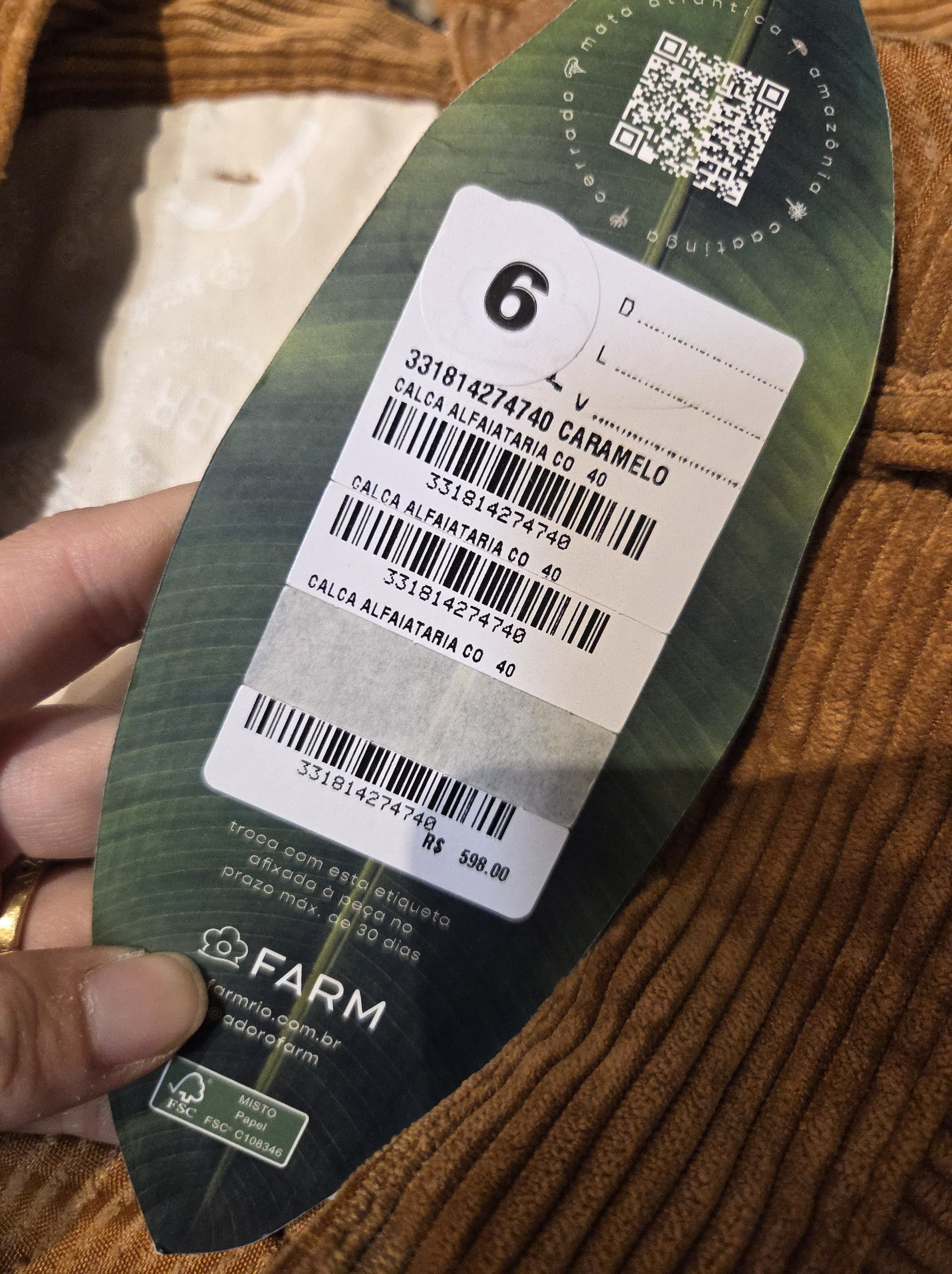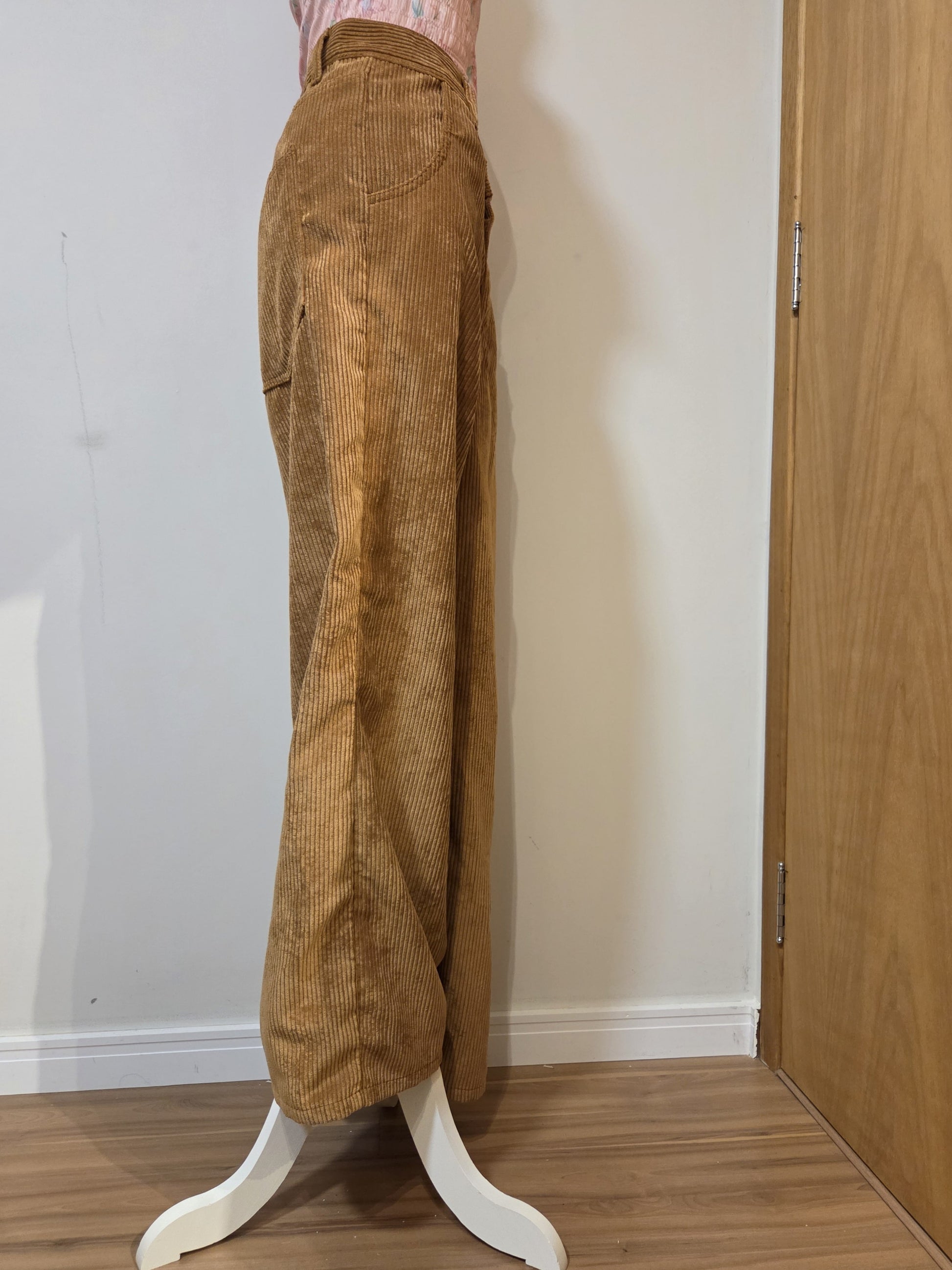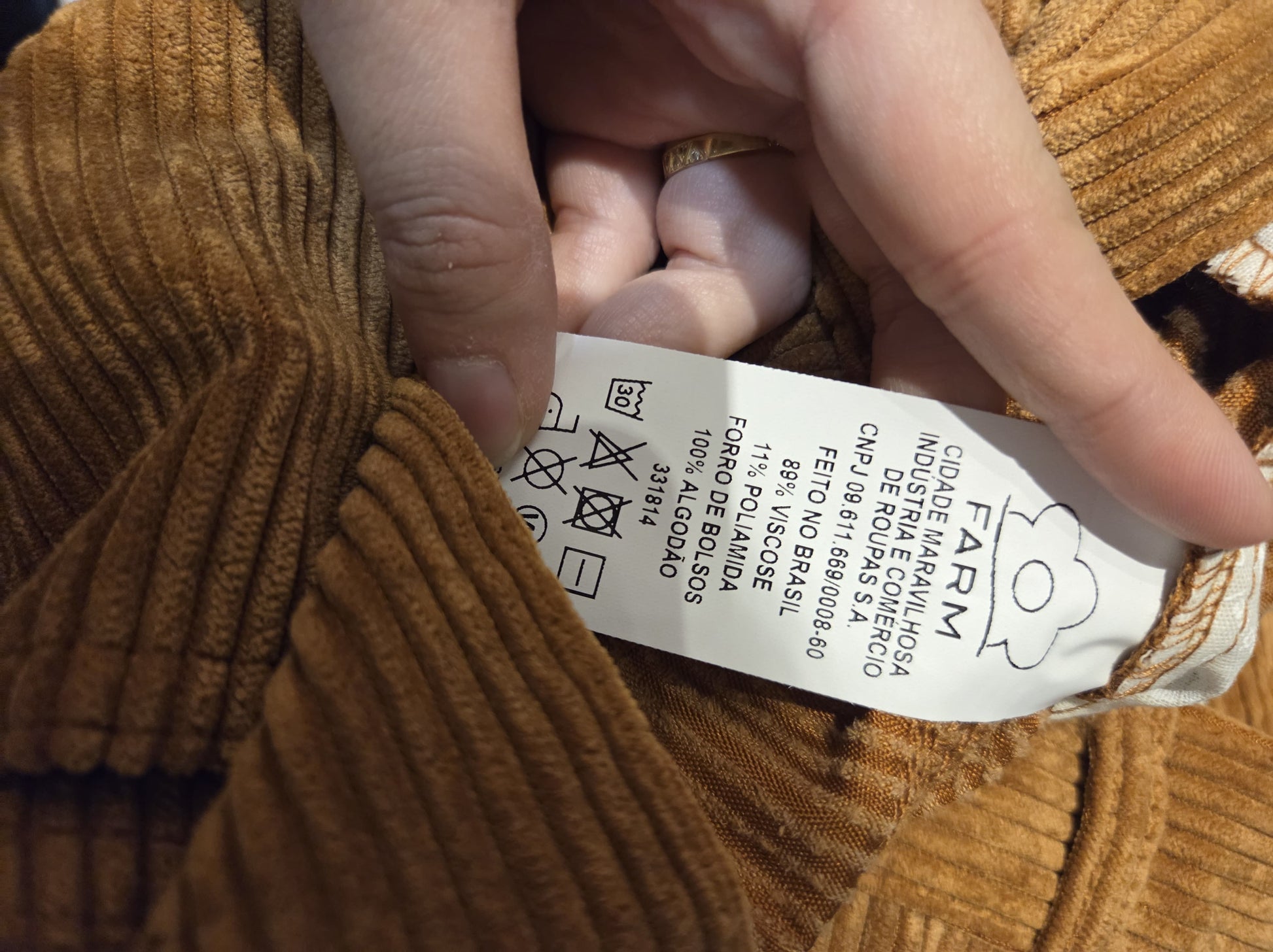 Calça feminina da marca Farm, nova e perfeita para um visual sofisticado e aconchegante. Confeccionada em veludo cotelê (corduroy) na cor caramelo, um tecido que proporciona uma textura macia, conforto e um toque retrô-chique. A composição do tecido principal é 89% Viscose e 11% Poliamida (conforme etiqueta), garantindo bom caimento e durabilidade. O forro dos bolsos é 100% algodão.