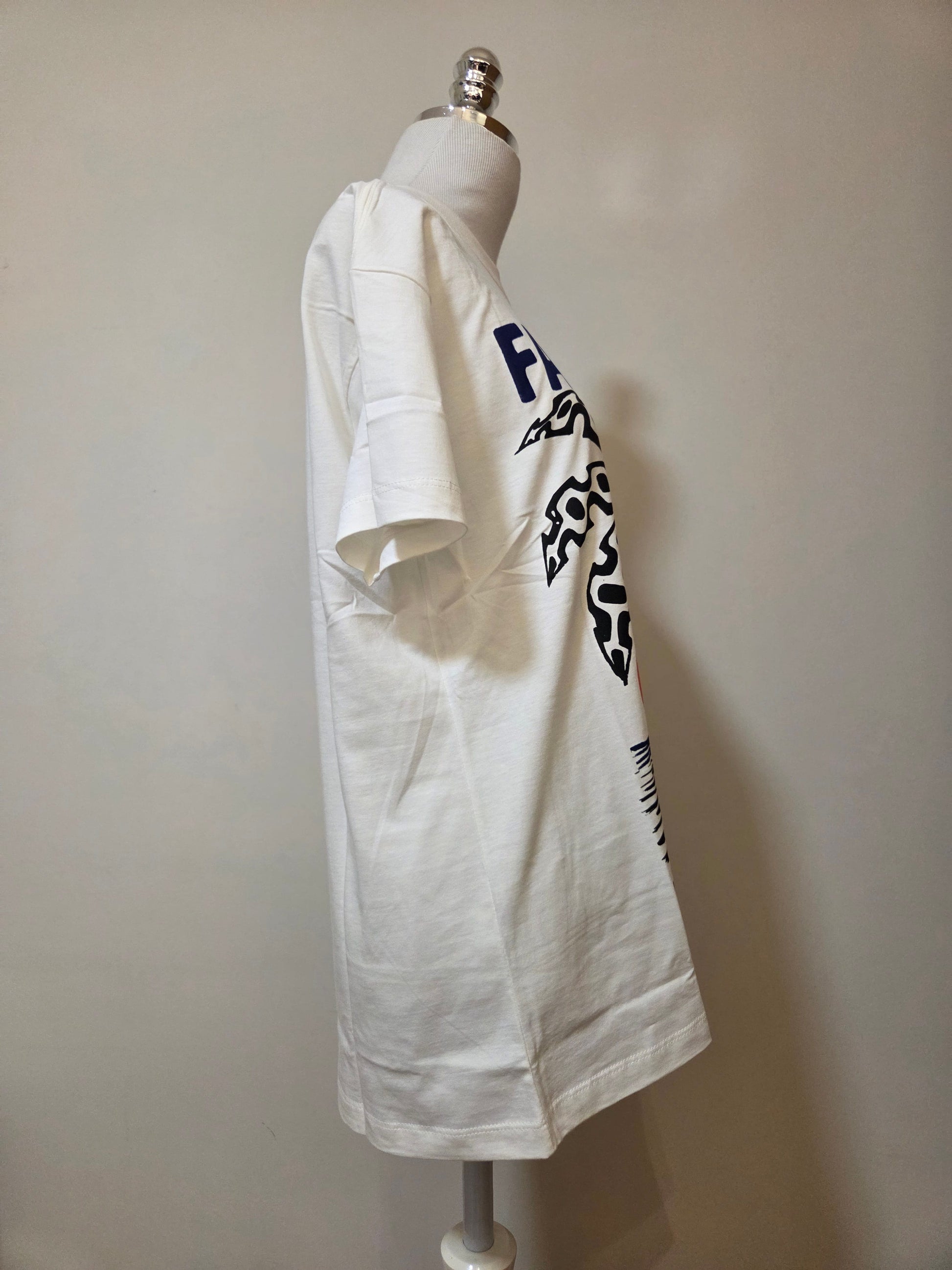 T-shirt Farm Rio original, confeccionada em malha de algodão premium na cor branca. Apresenta uma estampa artística e vibrante que homenageia o Rio de Janeiro, com um coqueiro estilizado em padrão de calçadão, sol poente e a frase "Made in Cidade Maravilhosa".