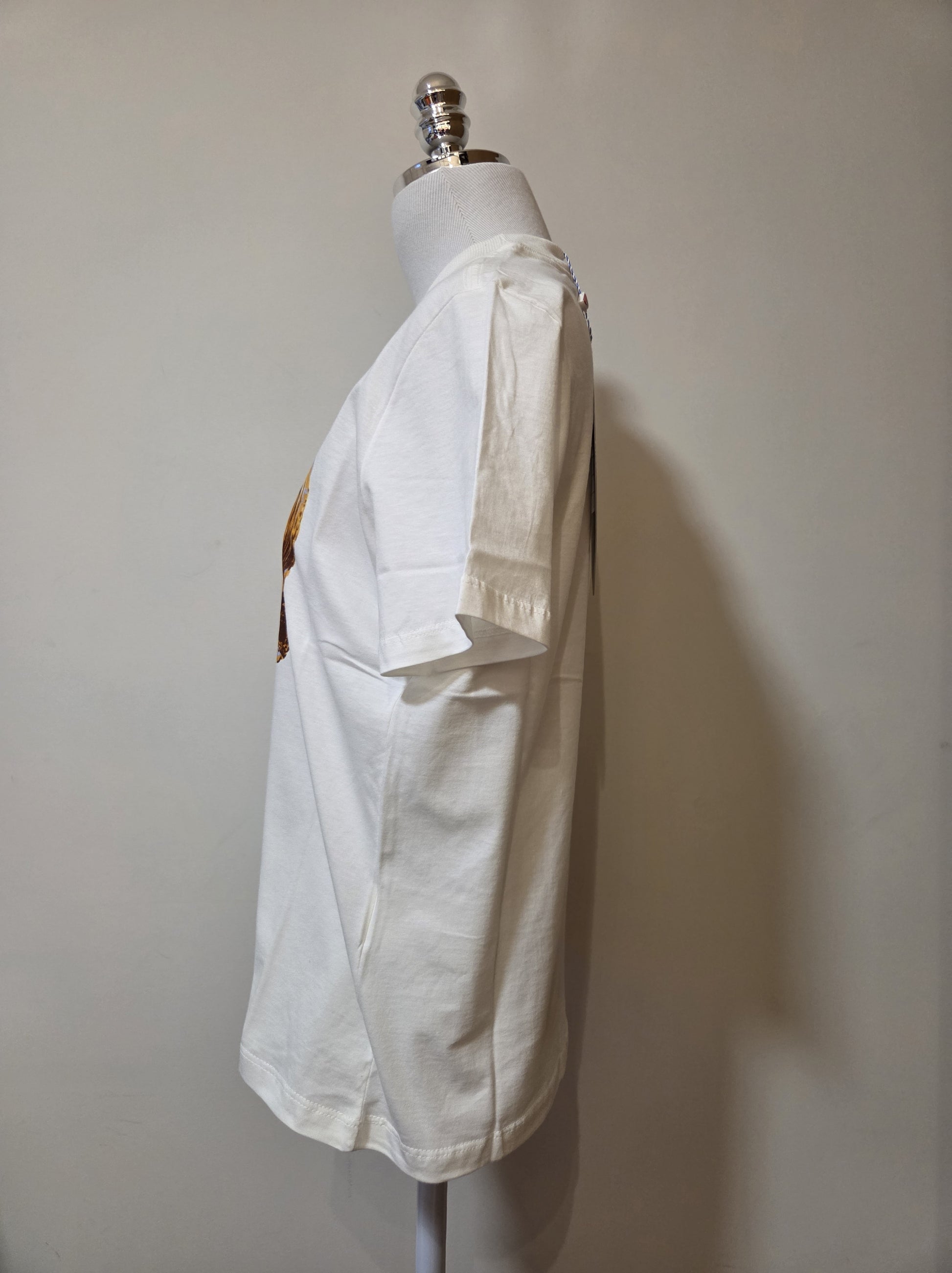 -  O "O" é uma ostra. A estampa em tons de amarelo, marrom e preto, contrasta com o fundo branco da camiseta. O modelo possui gola redonda e mangas curtas, com um caimento mais ajustado, proporcionando um look elegante e casual.
