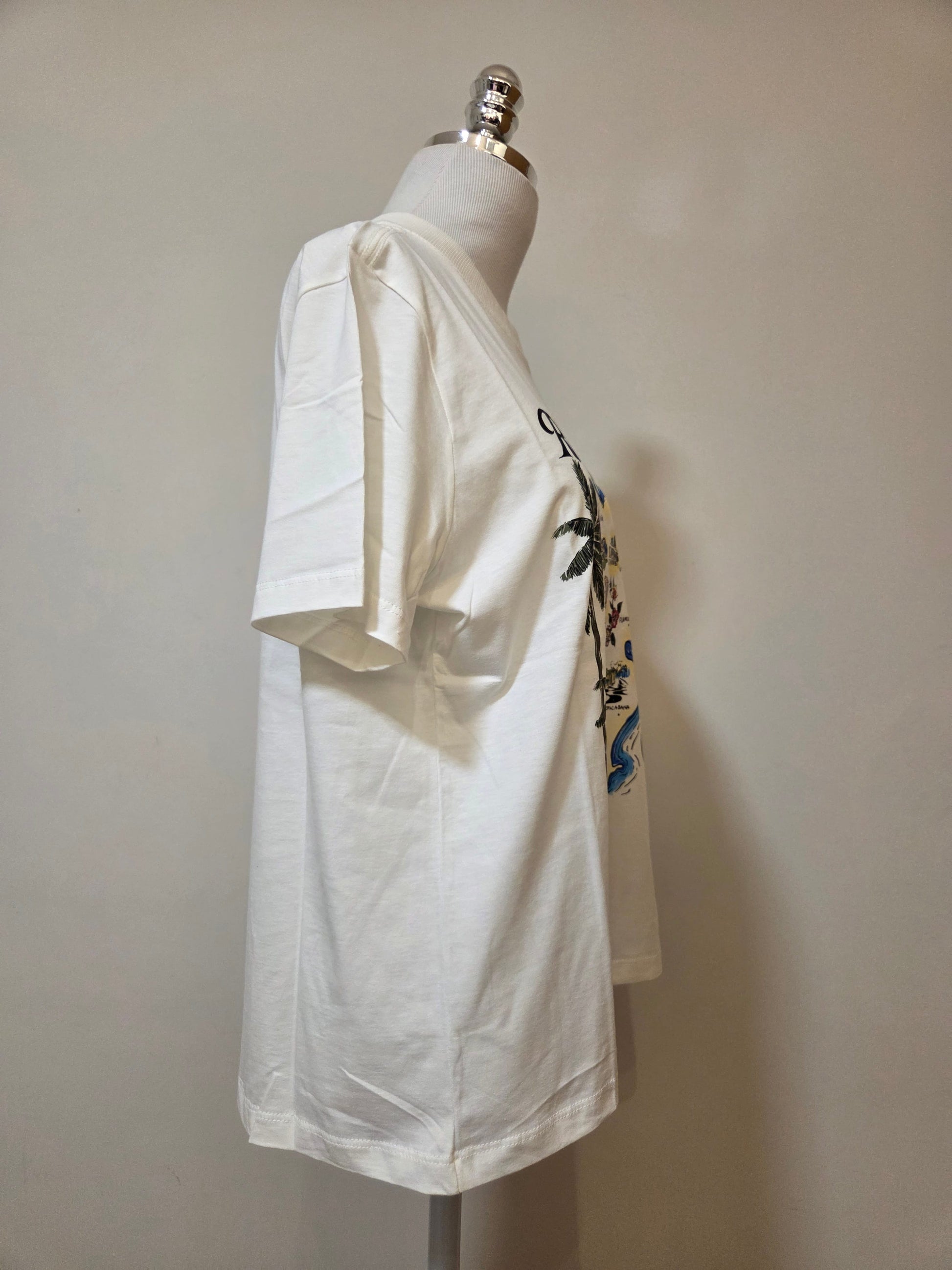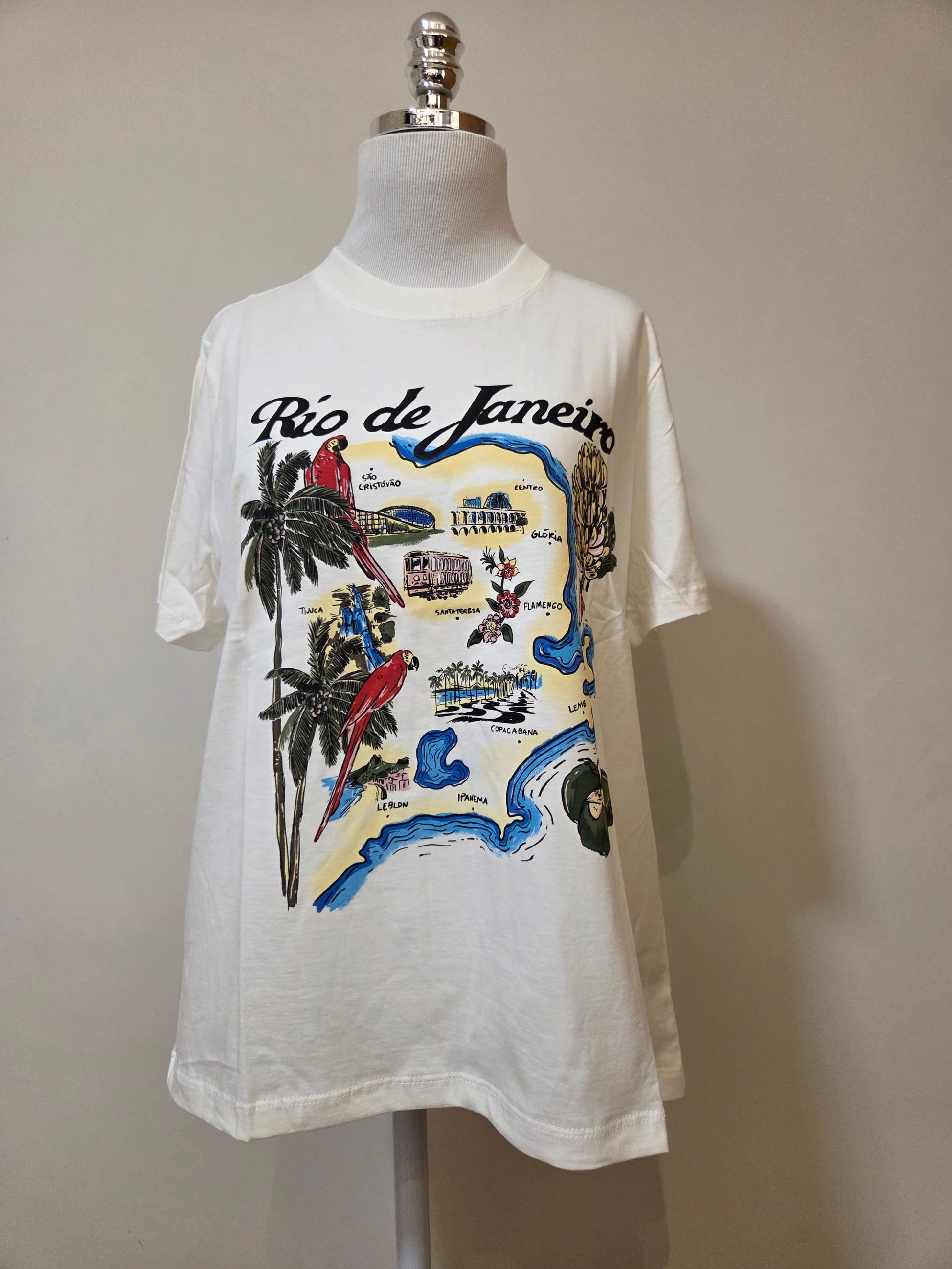 T-shirt Farm Rio original, confeccionada em malha de algodão macia na cor branca. Apresenta uma estampa artística e vibrante com o mapa ilustrado do Rio de Janeiro, destacando pontos icônicos como Ipanema, Copacabana e o Bondinho de Santa Teresa.
