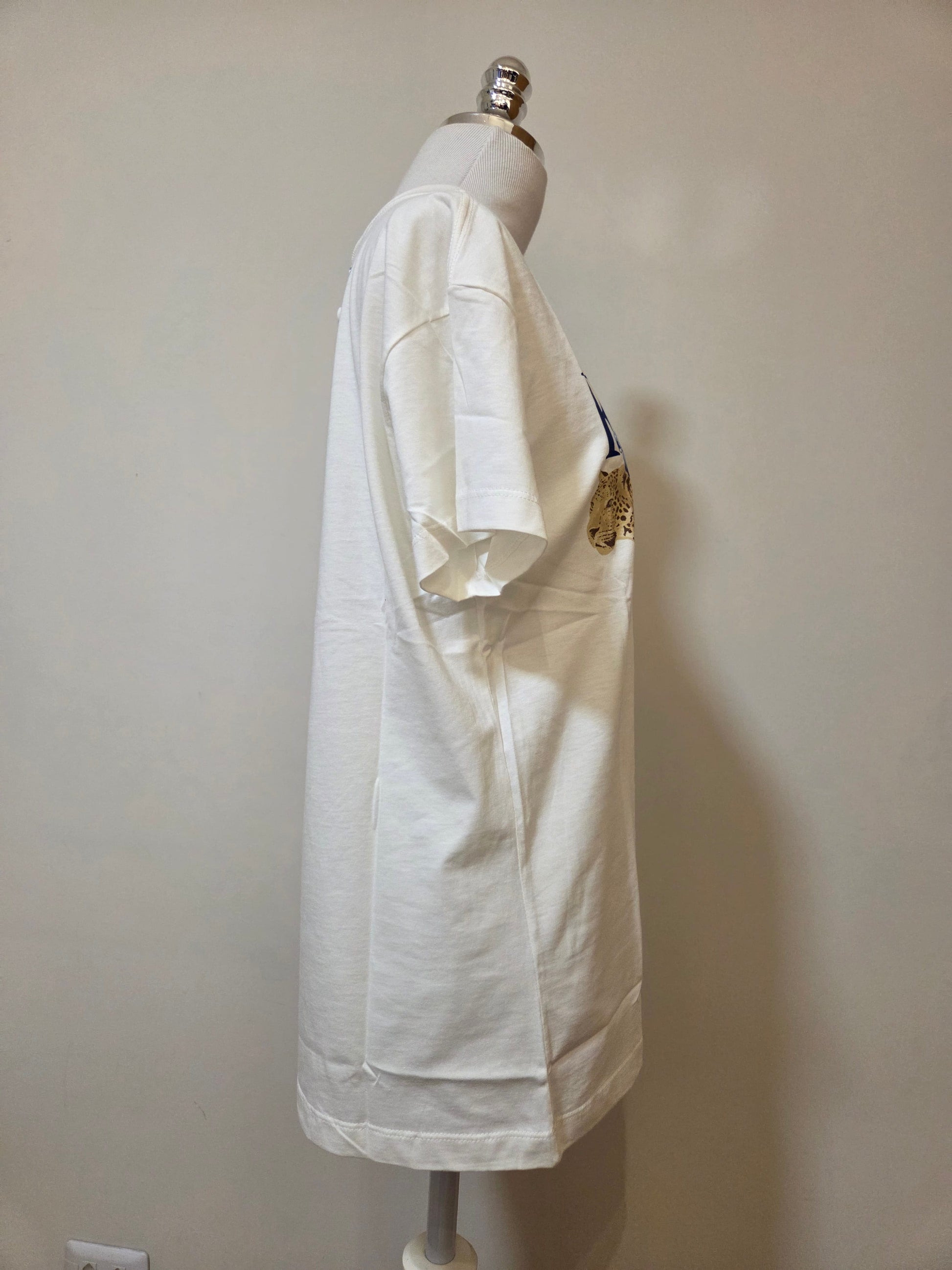 T-shirt Farm Rio original, confeccionada em malha de algodão premium na cor branca. Apresenta uma estampa icônica e artística que une a força da onça pintada com a delicadeza de pássaros azuis, em um corte amplo que garante conforto e estilo.