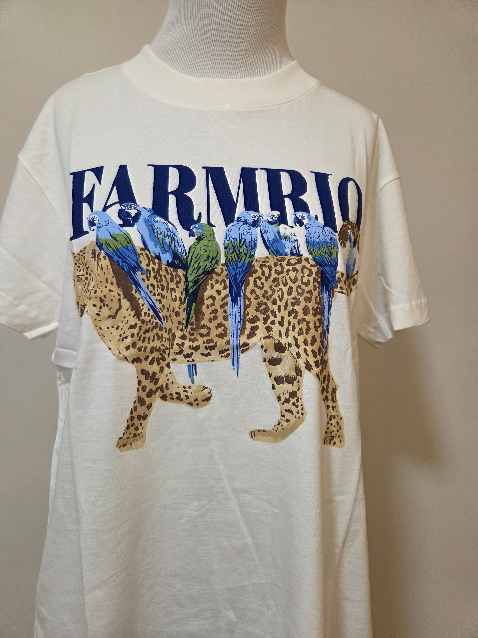 Estampa: Onça pintada com diversos pássaros (araras e periquitos) em tons de azul e verde, encimada pelo logo "FARM RIO" em marinho.