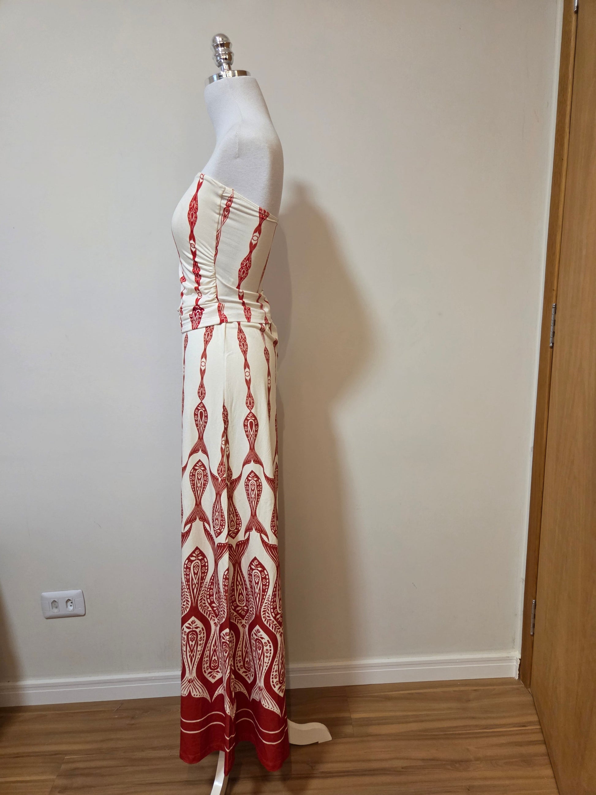 Detalhes: Estampa de peixes, top tomara que caia e calça pantalona.