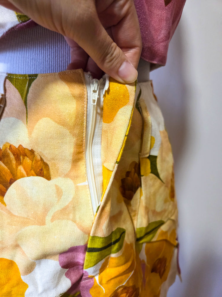 A estampa é um belíssimo Maxi Floral, com grandes flores em tons de rosa vibrante e amarelo/mostarda, sobre um fundo off-white, criando um efeito visual impactante e alegre.