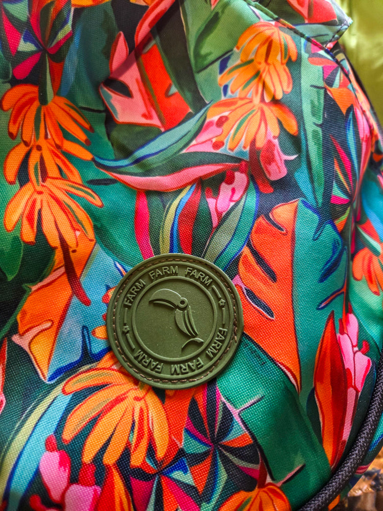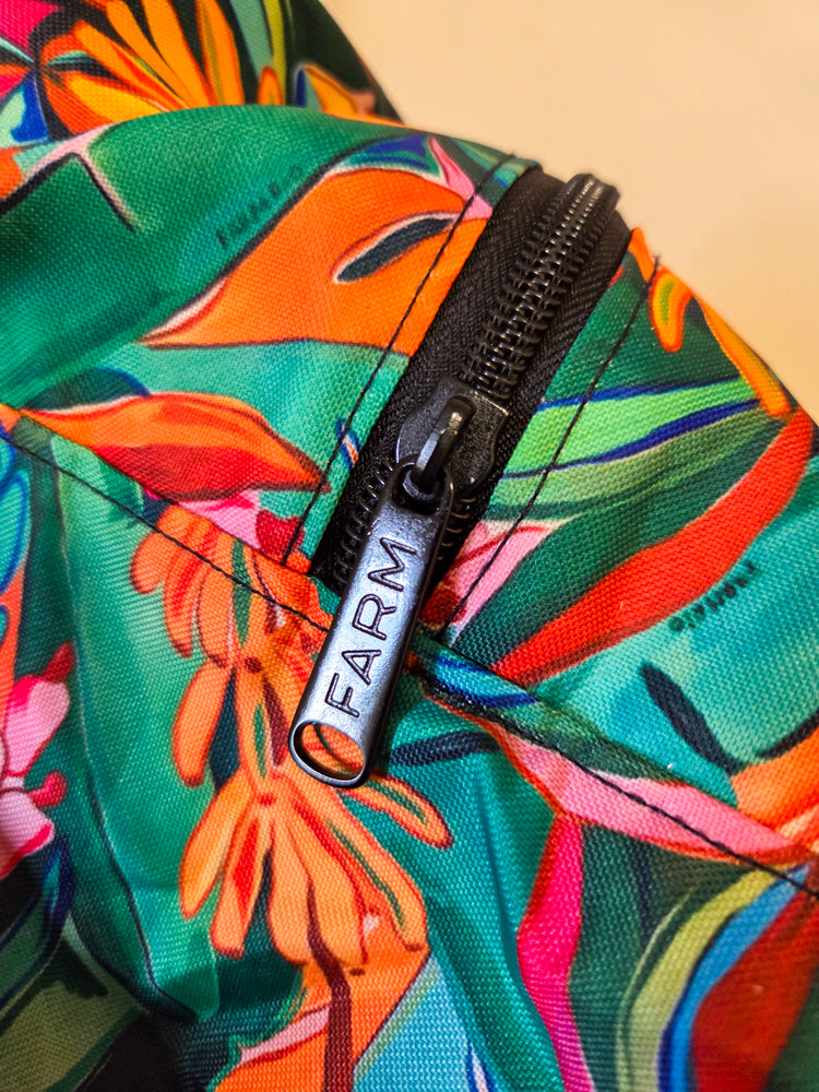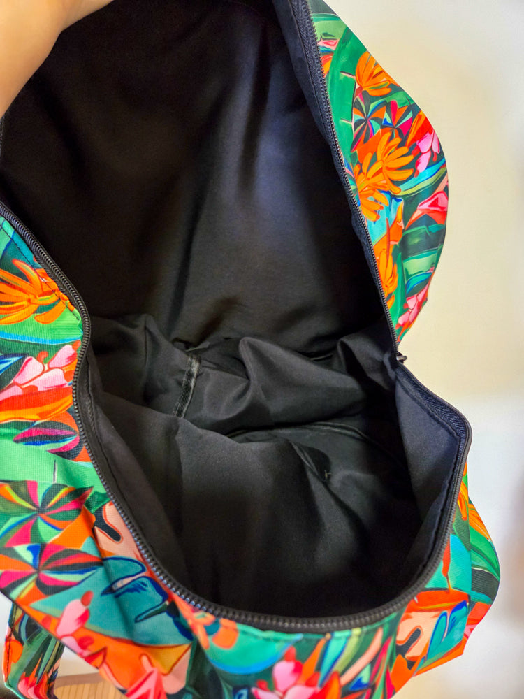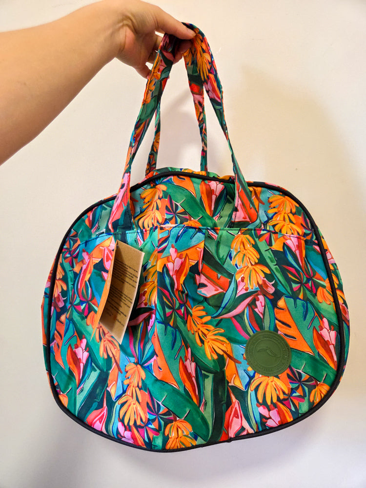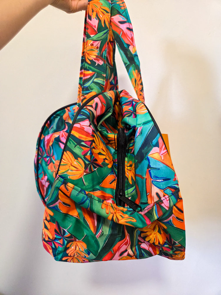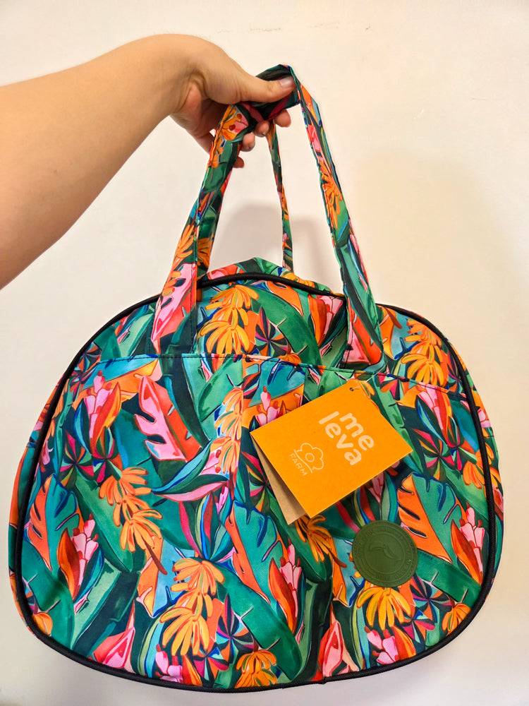 Bolsa mala da marca Farm, da linha "Me Leva",é uma peça funcional e estilosa, ideal para viagens curtas, academia ou uso diário. Possui um design bem amplo, otimizando o espaço interno. A estampa exclusiva é vibrante, com motivos que remetem a bananeiras e elementos tropicais, em uma rica paleta de tons de verde, combinados com toques de rosa e outros detalhes coloridos. Conta com fechamento seguro por zíper e alças resistentes para transporte confortável.
