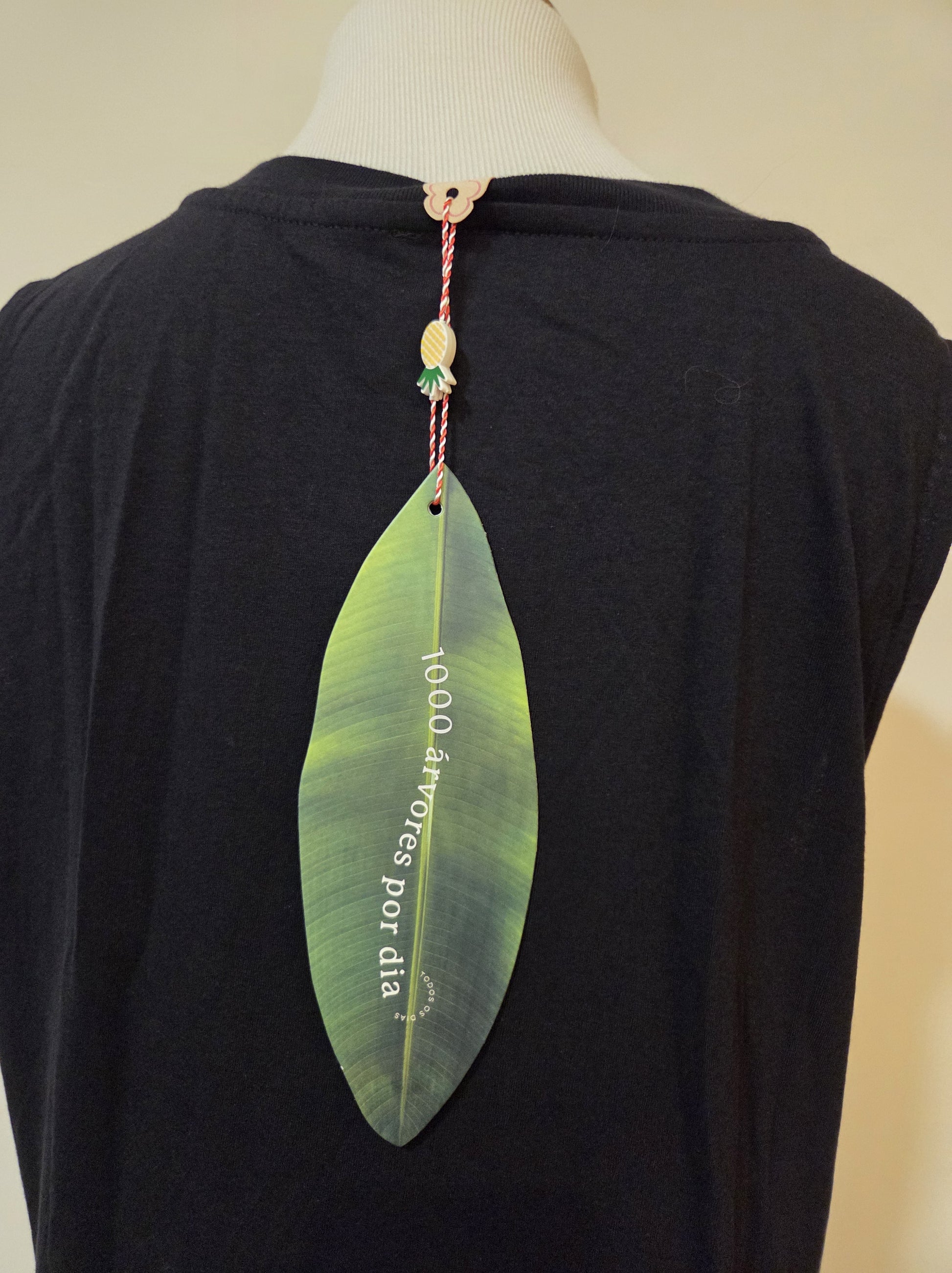 Parte Inferior: Estampa exuberante de folhagens e formas orgânicas, com blocos de cores como laranja, roxo, rosa, azul e preto.