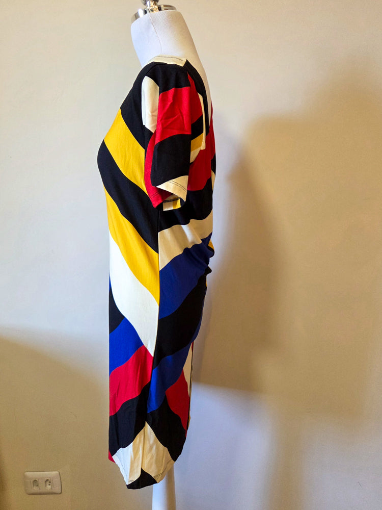 A estampa é a vibrante "Formas Colorido", um design geométrico com grandes blocos de cores como amarelo, vermelho, azul royal, preto e branco. O padrão centralizado cria uma ilusão de ótica e alonga a silhueta.