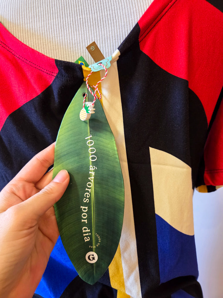A modelagem é solta (estilo A ou trapézio) com manga curta e decote redondo discreto. Uma peça statement para um look casual e divertido.