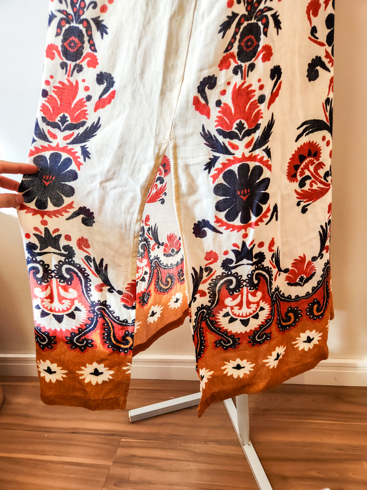 O destaque é a estampa centralizada, que remete a um detalhado tapeçaria em tons terrosos, azul marinho e vermelho sobre um fundo cru (off-white). O design superior apresenta alcinhas finas e reguláveis, e um charmoso decote frontal com detalhe de amarração/laço no busto, criando um cutout sutil. A modelagem é reta na parte de baixo, com um recorte final em um tom mais quente e uma fenda lateral discreta para facilitar o movimento. Uma peça que evoca a brasilidade com elegância e conforto.