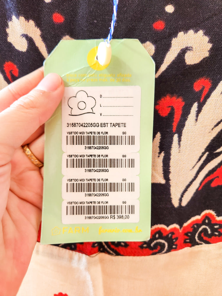Adicione um toque boêmio e sofisticado ao seu guarda-roupa com este deslumbrante Vestido Midi da Farm, na exclusiva estampa "Tapete de Flor".