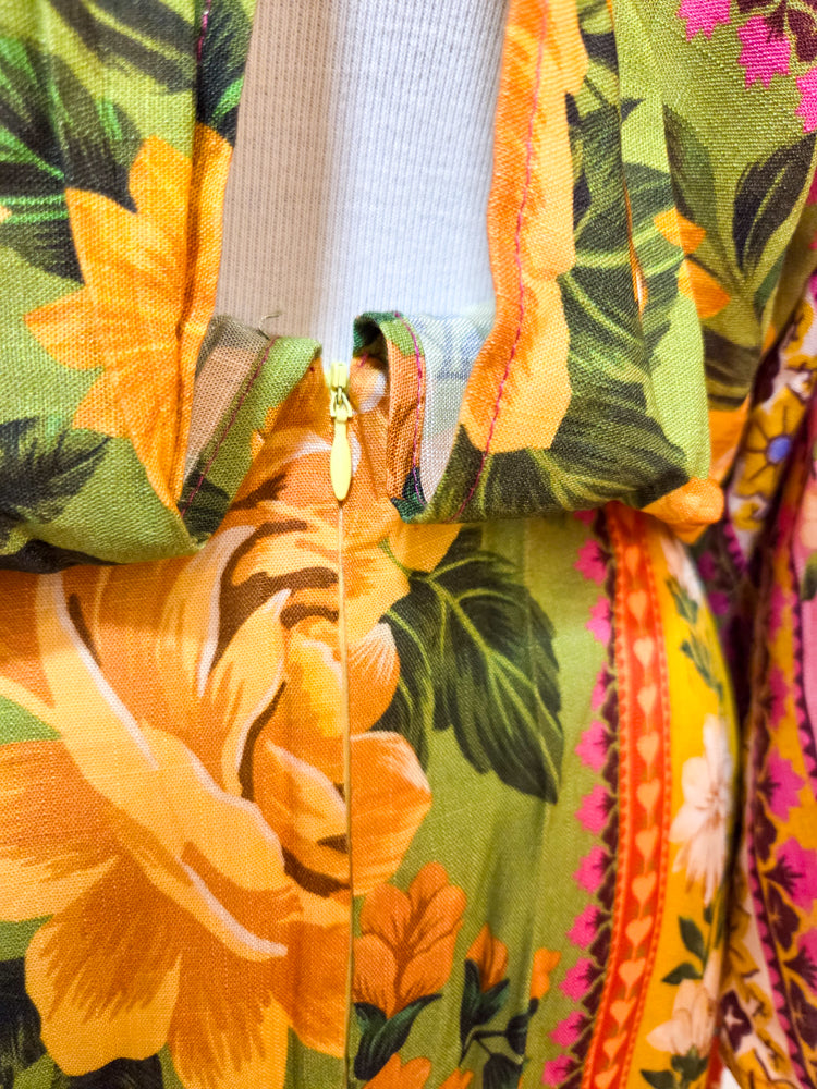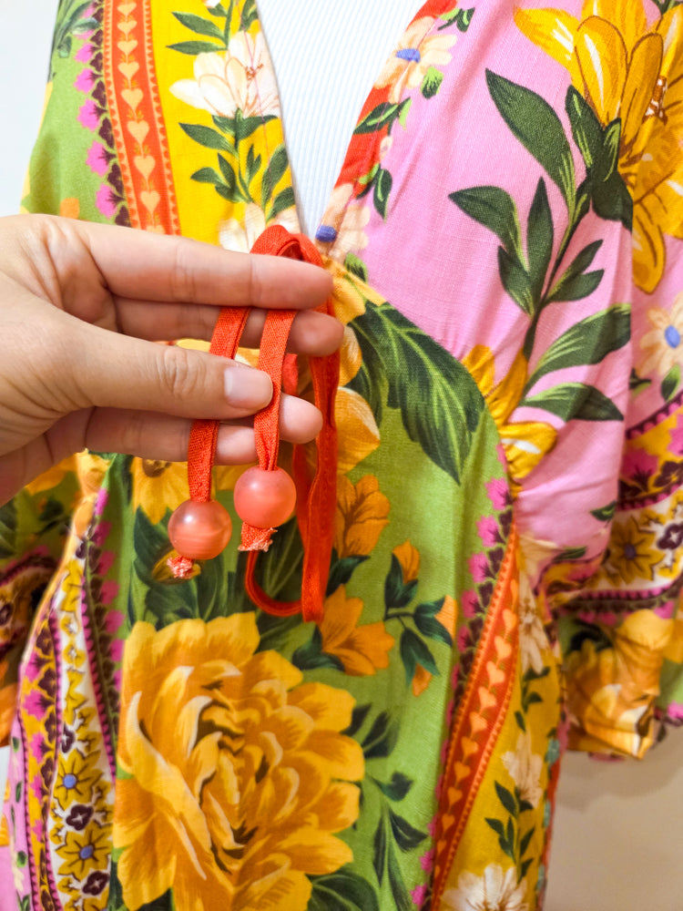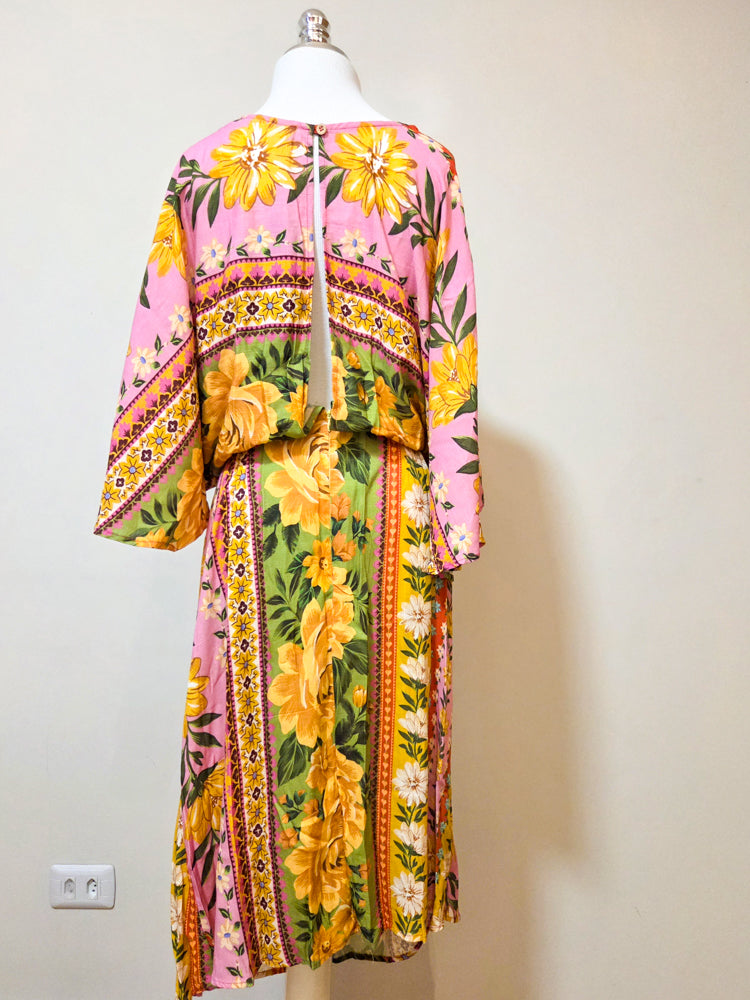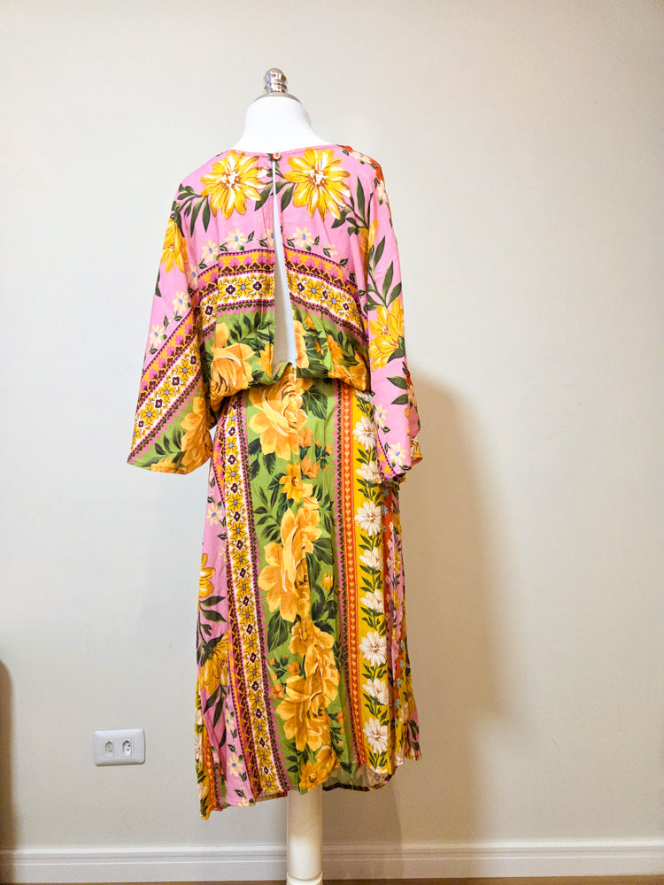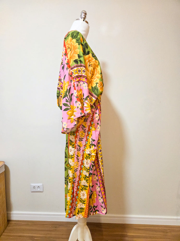 O destaque da peça é a estampa vibrante e colorida, que combina flores exuberantes, padrões étnicos e elementos em faixas verticais. A paleta de cores é rica, com tons de rosa, verde, amarelo, laranja e vermelho, criando um visual impactante.