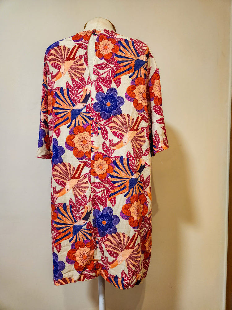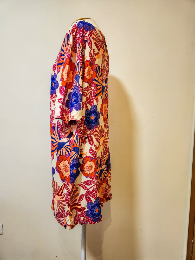 Vestido feminino novo, com modelagem tipo t-shirt, oferecendo conforto e estilo para o dia a dia. Confeccionado em tecido 100% viscose, proporciona um caimento leve, fluido e fresco, ideal para os dias quentes. A peça se destaca por sua estampa floral vibrante, que combina um fundo off white em tons de rosa e azul e aves, criando um visual tropical e alegre. Possui gola redonda e um pequeno botão para fechamento na parte de trás do pescoço, facilitando o vestir.