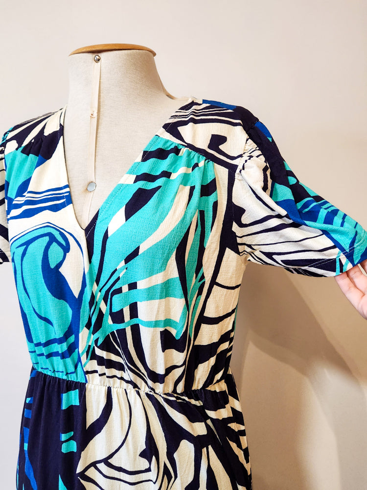 Estampa: Floral e de folhagens em tons vibrantes de azul, turquesa, preto e off-white, criando um visual moderno e sofisticado.