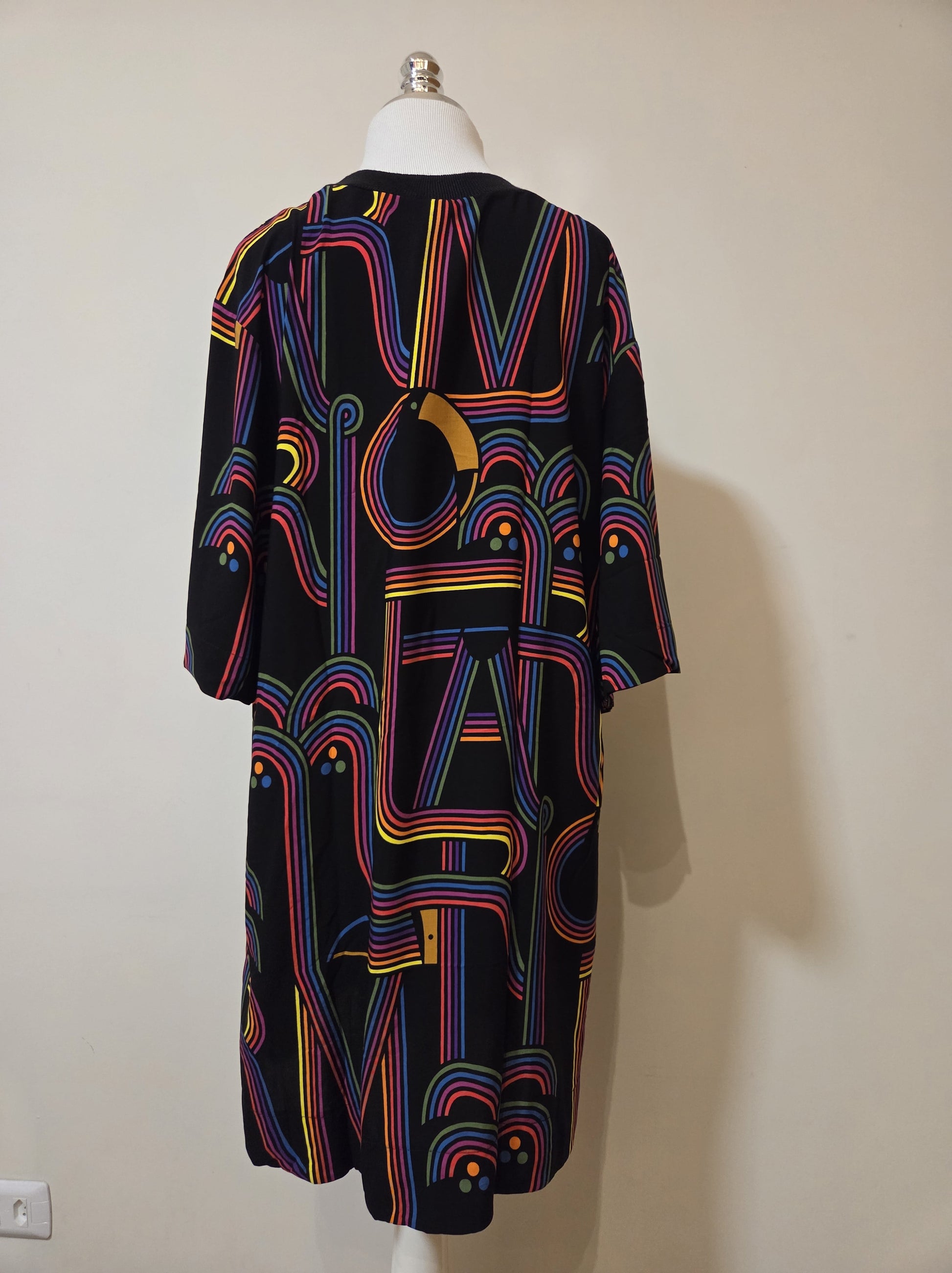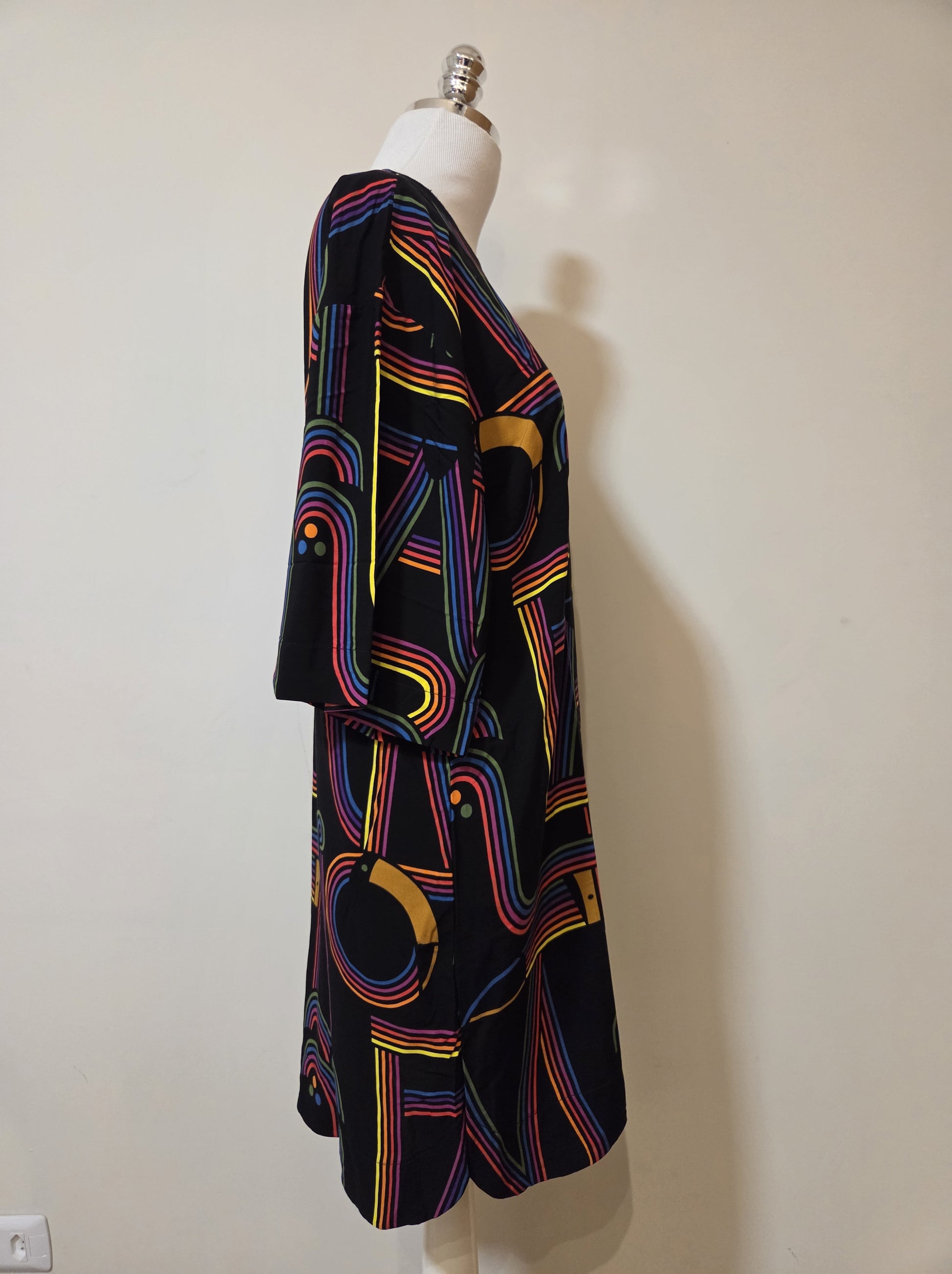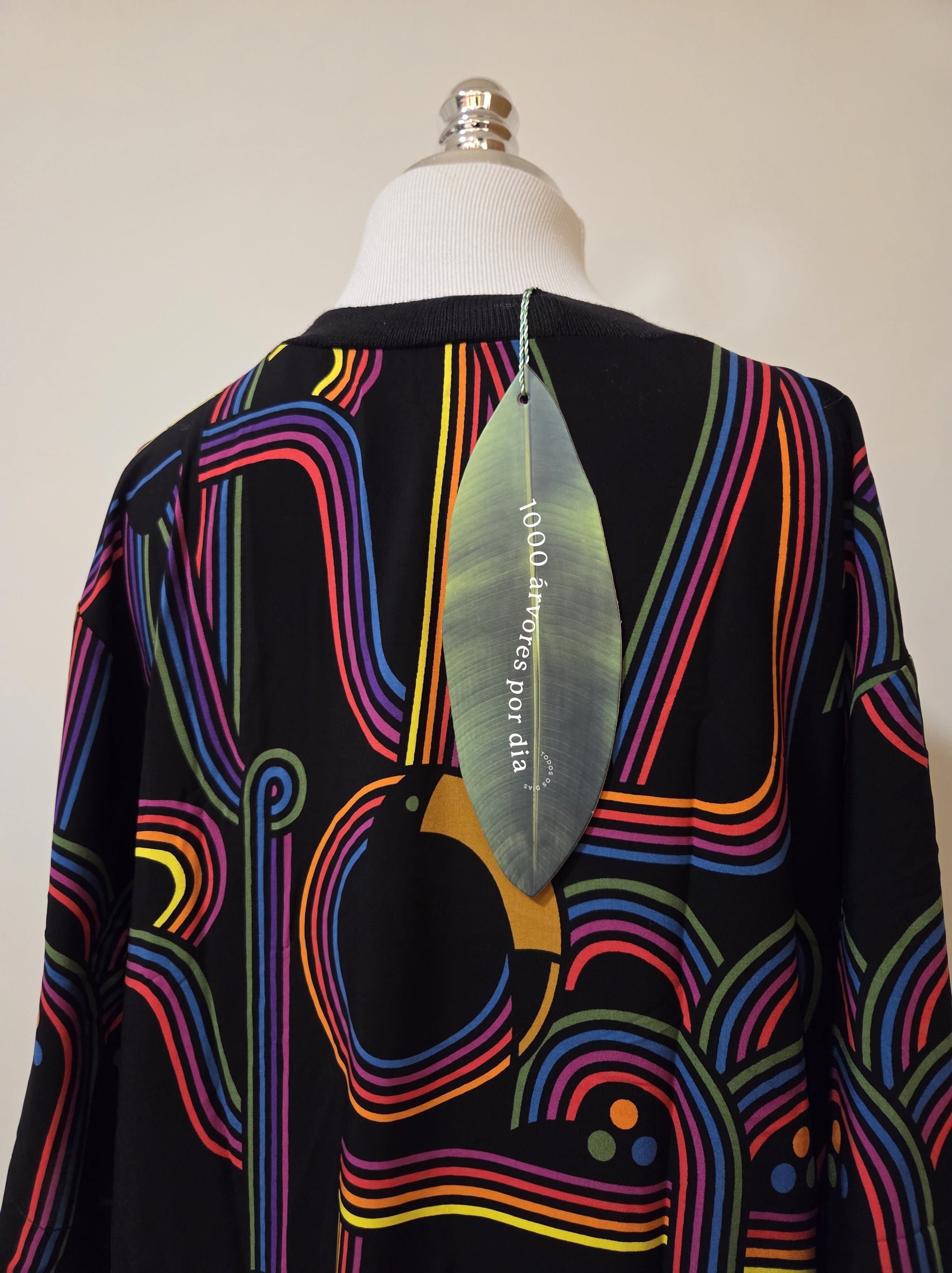 O grande destaque é a estampa exclusiva "Tuca", um design abstrato e geométrico que combina formas curvas e retas em um festival de cores vibrantes. Sobre o fundo preto, a estampa se revela em tons de amarelo, vermelho, rosa, azul e verde, formando um desenho que remete a formas orgânicas e até mesmo ao nome da estampa. O estilo camisetão com modelagem oversized (ampla e solta) proporciona um look moderno e descontraído, com mangas curtas e gola redonda.