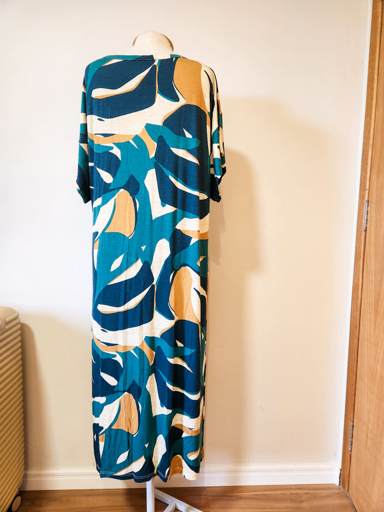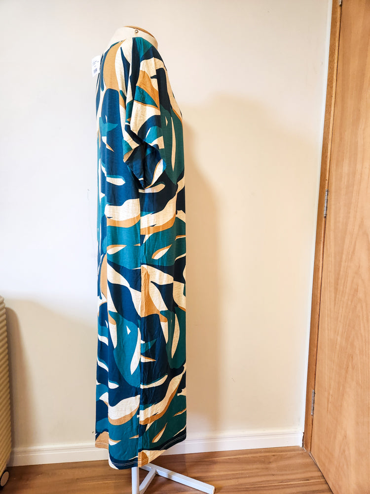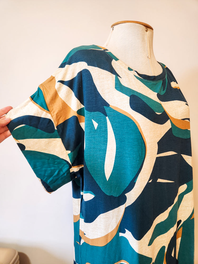 Confeccionado em viscose, o tecido é macio, leve e oferece um caimento fluído e confortável, ideal para o dia a dia e para os dias quentes. A estampa exclusiva é um destaque: um design abstrato com formas que lembram folhagens em uma paleta de cores sofisticada, combinando tons de verde, azul, off-white e marrom.